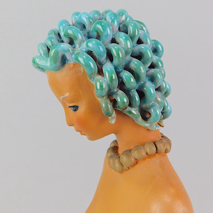 Designed by Adolf Prischi who worked for goldscheider and kerolos C. 1936, very rare nude female terracotta statue wearing a necklace with blue sausage curled hair typical of Goldscheider.
