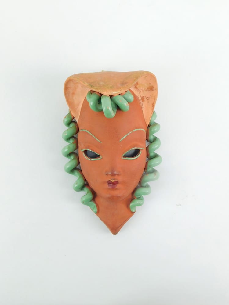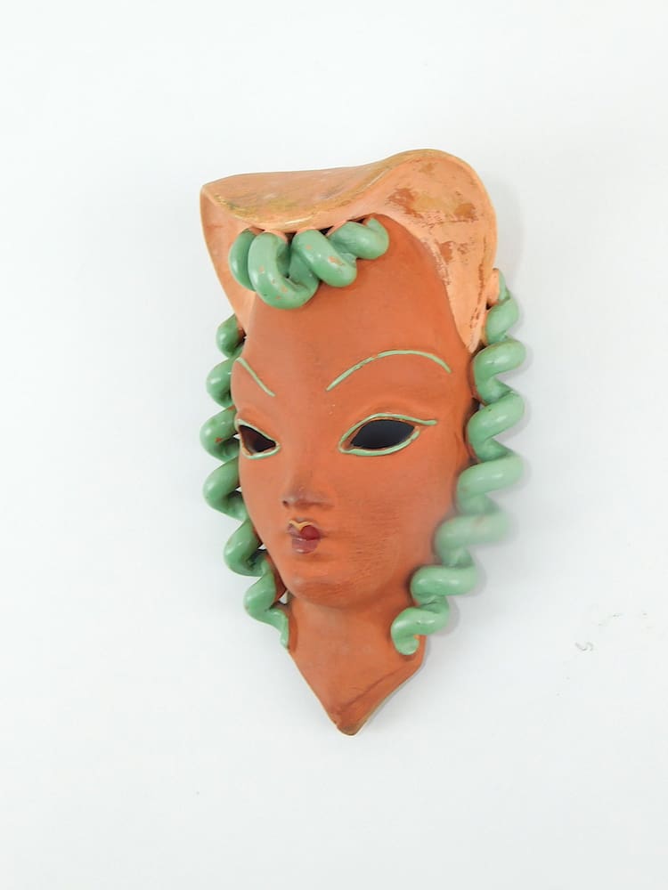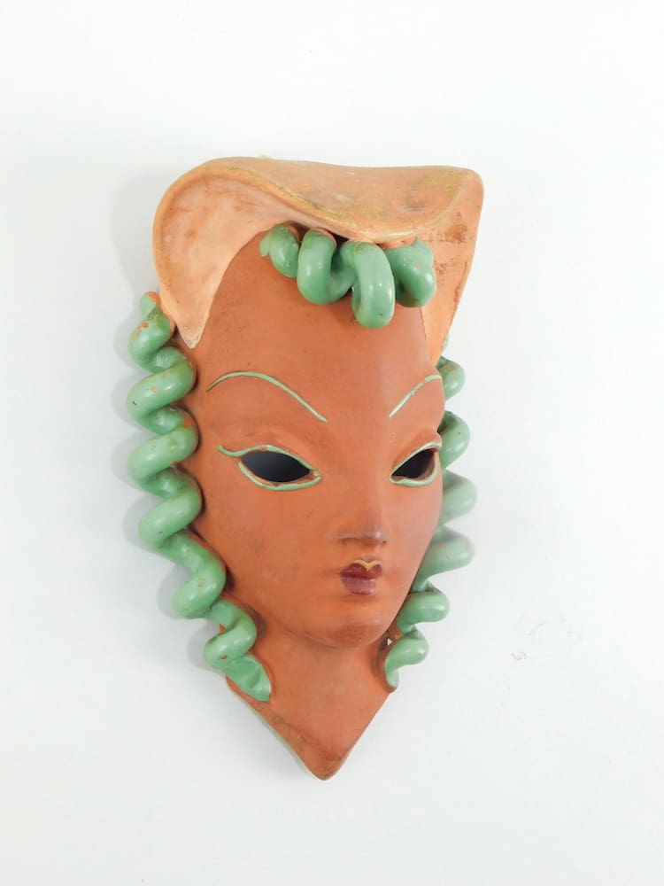 A smaller eyeless terracotta mask with Goldscheider type curls in green probably designed by Karl Grossl.