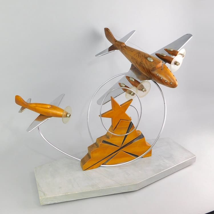 French hand made, hand carved walnut planes statue. Mounted on a grey marble base. These planes statues are now almost impossible to find. An amazing and very rare statue – ideal for a boardroom buffet.