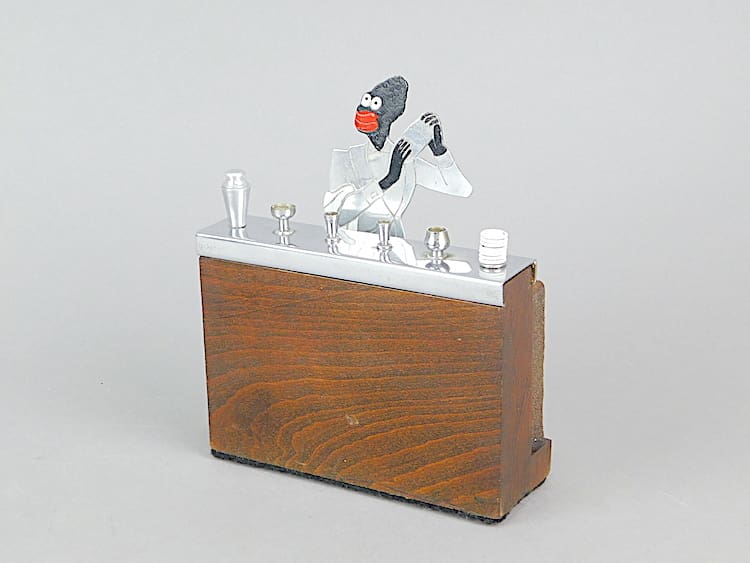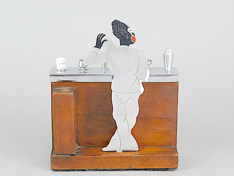 An unsigned French art deco Sudre bartender behind a bar. Slide the top of the bar to reveal cigarette holders in the bar. To the back of the bar is a hole which may have originally contained a bottle lighter which is not longer present. The hole could be used for cocktail sticks or tooth picks.