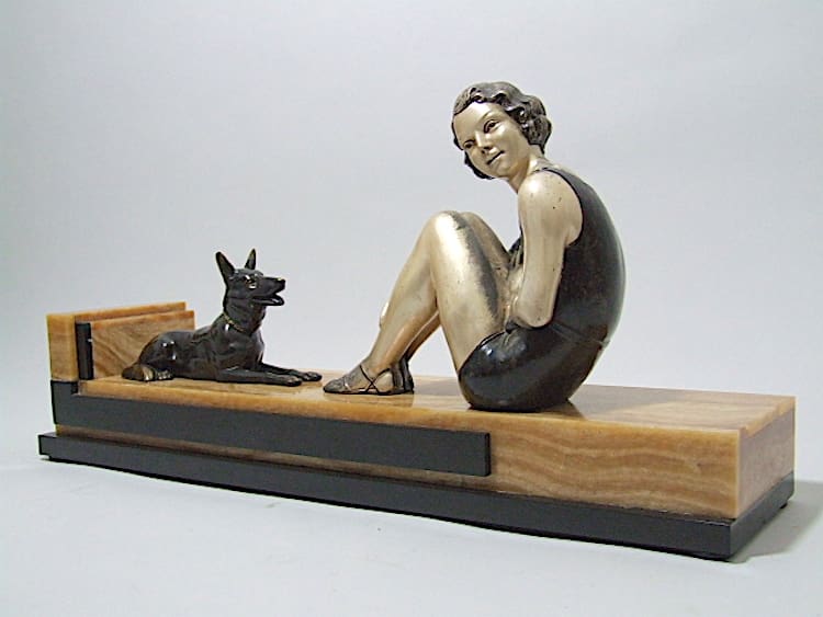 French art deco spelter bather figure. Unsigned but the work of Enrique Molins-Balleste, Spanish artist working in France during the 1920 and 1930s. Figural group showing a lady in swimming costume sitting with a dog. I also have this same lady with a clock. Base is made of black and brown marble.