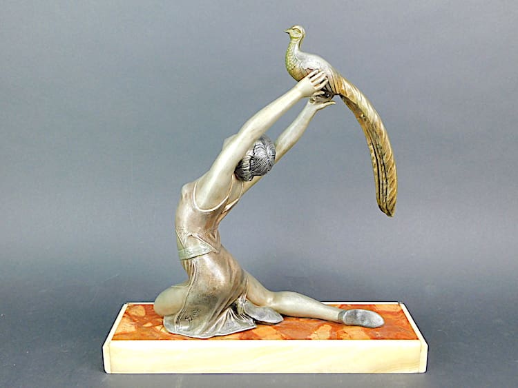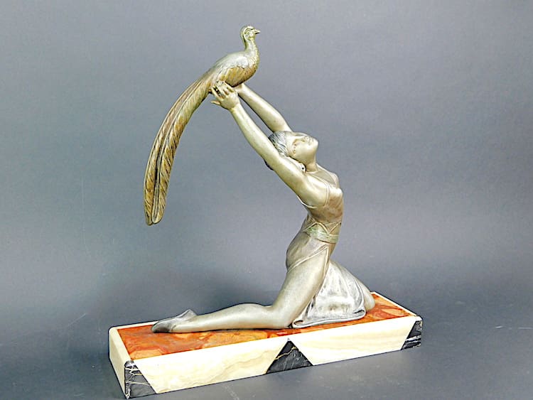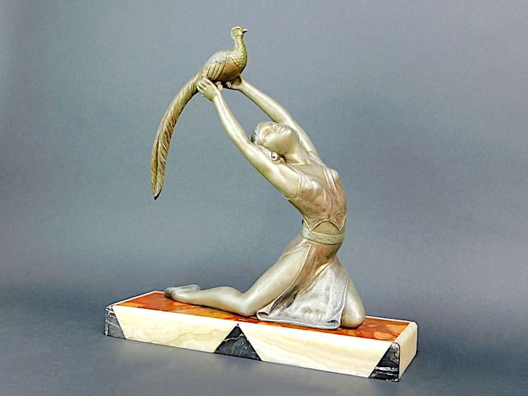 French art deco spelter bird lady a signed piece by Salvadoro (Voltas), signed to the back of her dress. Mounted on a Rosso marble and cream onyx base.