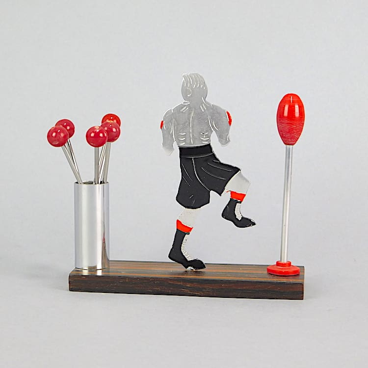 French art deco 2-dimensional Boxer cocktail sticks set. Made by Sudre but this one unsigned. The red balls in the pot are the cocktail sticks. Mounted on a macassar ebony wooden base.