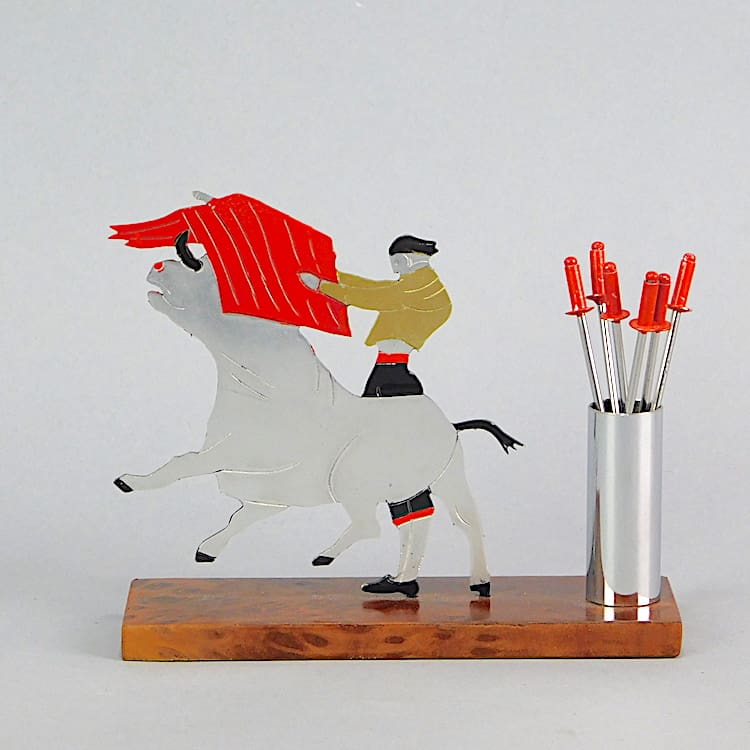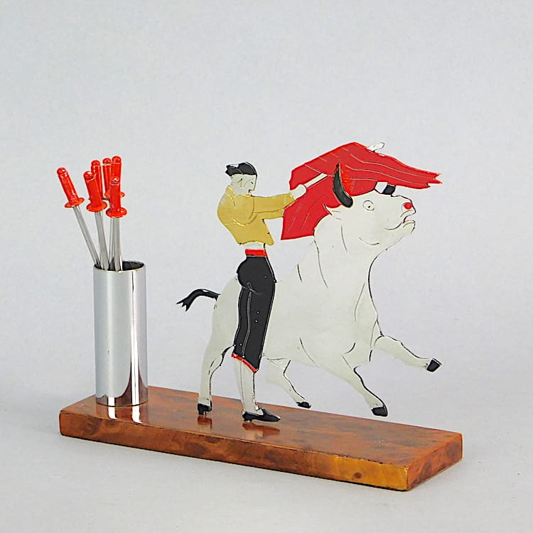 French cocktail sticks set by Sudre modelled as a bullfighter with the swords as the cocktail sticks. Base is made of amboyne wood.