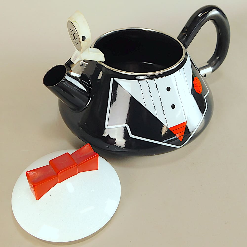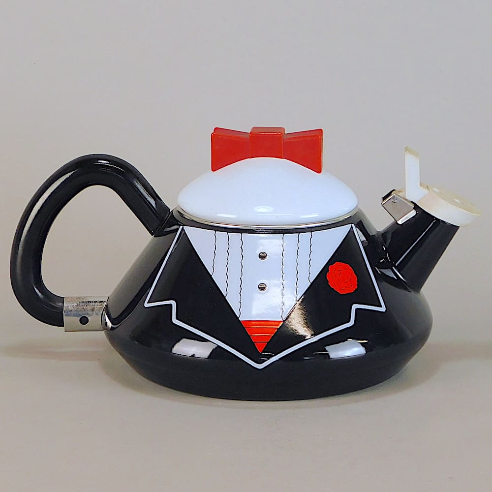 A whacky enamel kettle with red phenolic bow tie lid handle.