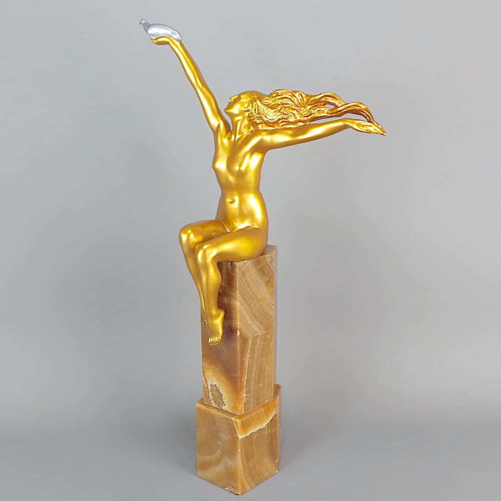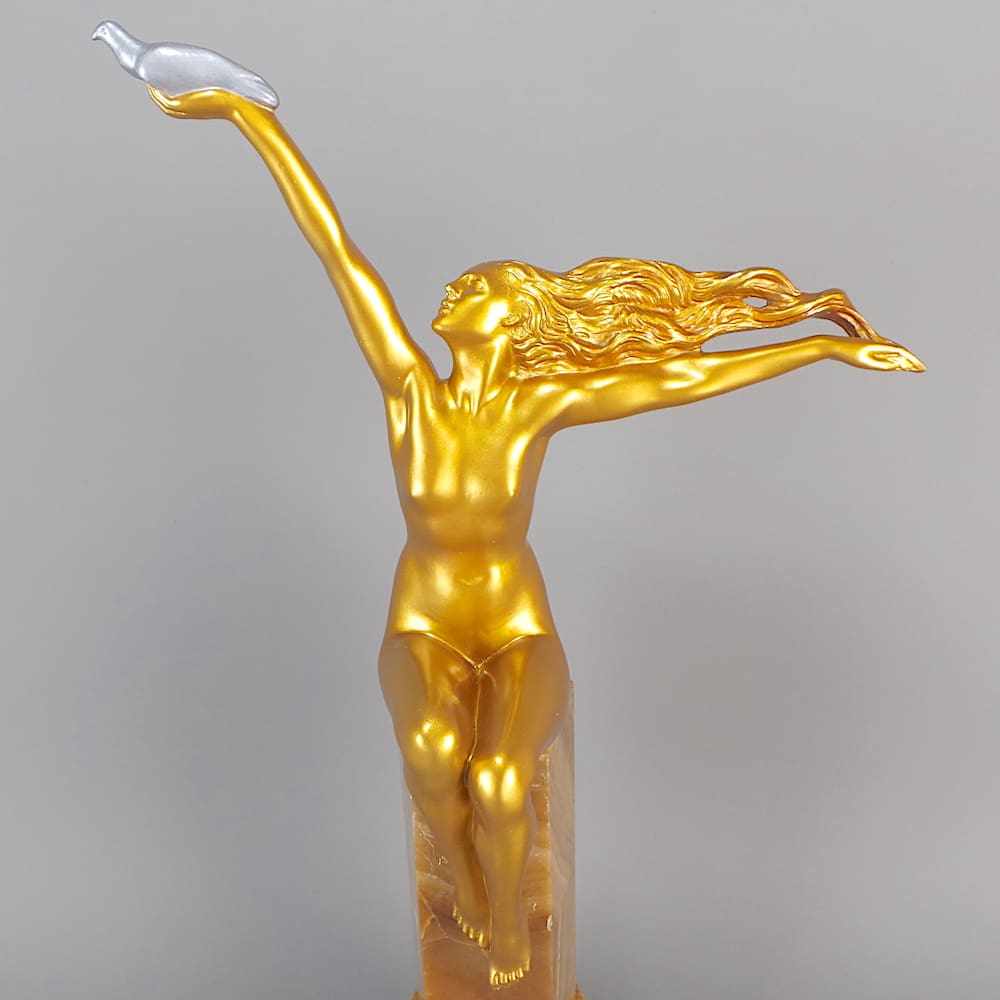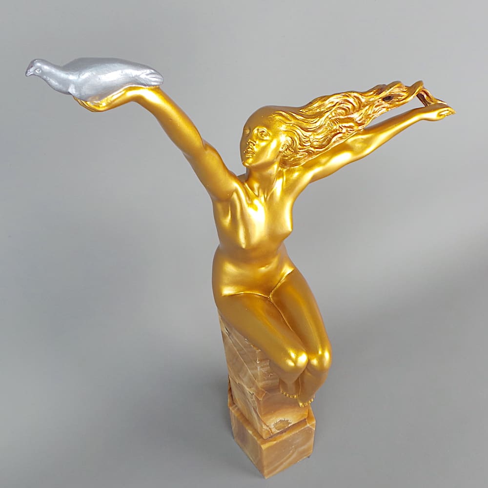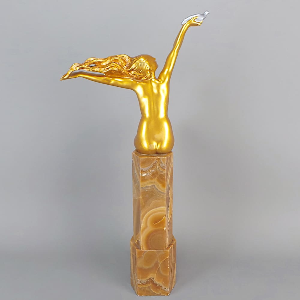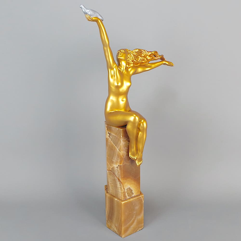 French golden patinated bronze art deco statue known as the Carrier Pigeon.