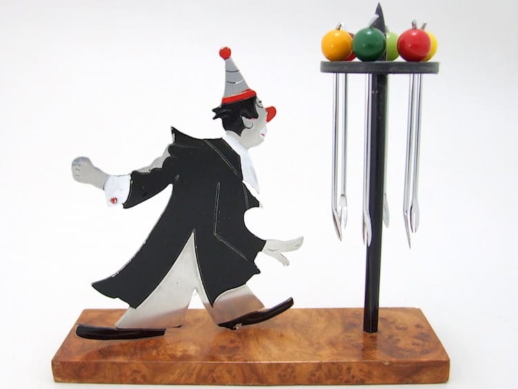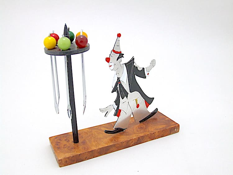 French art deco cocktail stick set depicting a clown. An unsigned Sudre. Mounted on a amboyne wooden base.