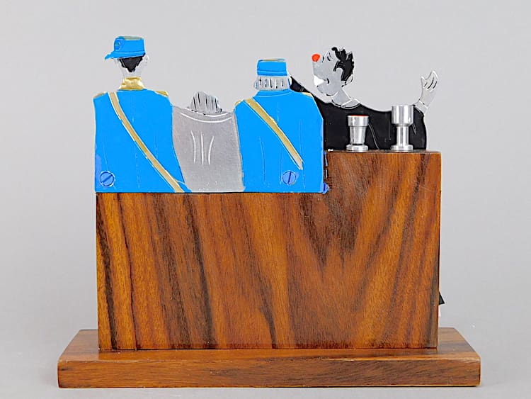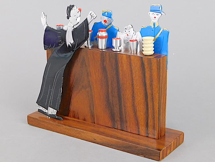 French art deco Court case cocktail sticks set by Sudre. A drunken man standing between two gendarmes behind a Macassar bar. To the front of the bar is the Prosecutor. To the top of the bar are 7 metal bottle and cup cocktail sticks.