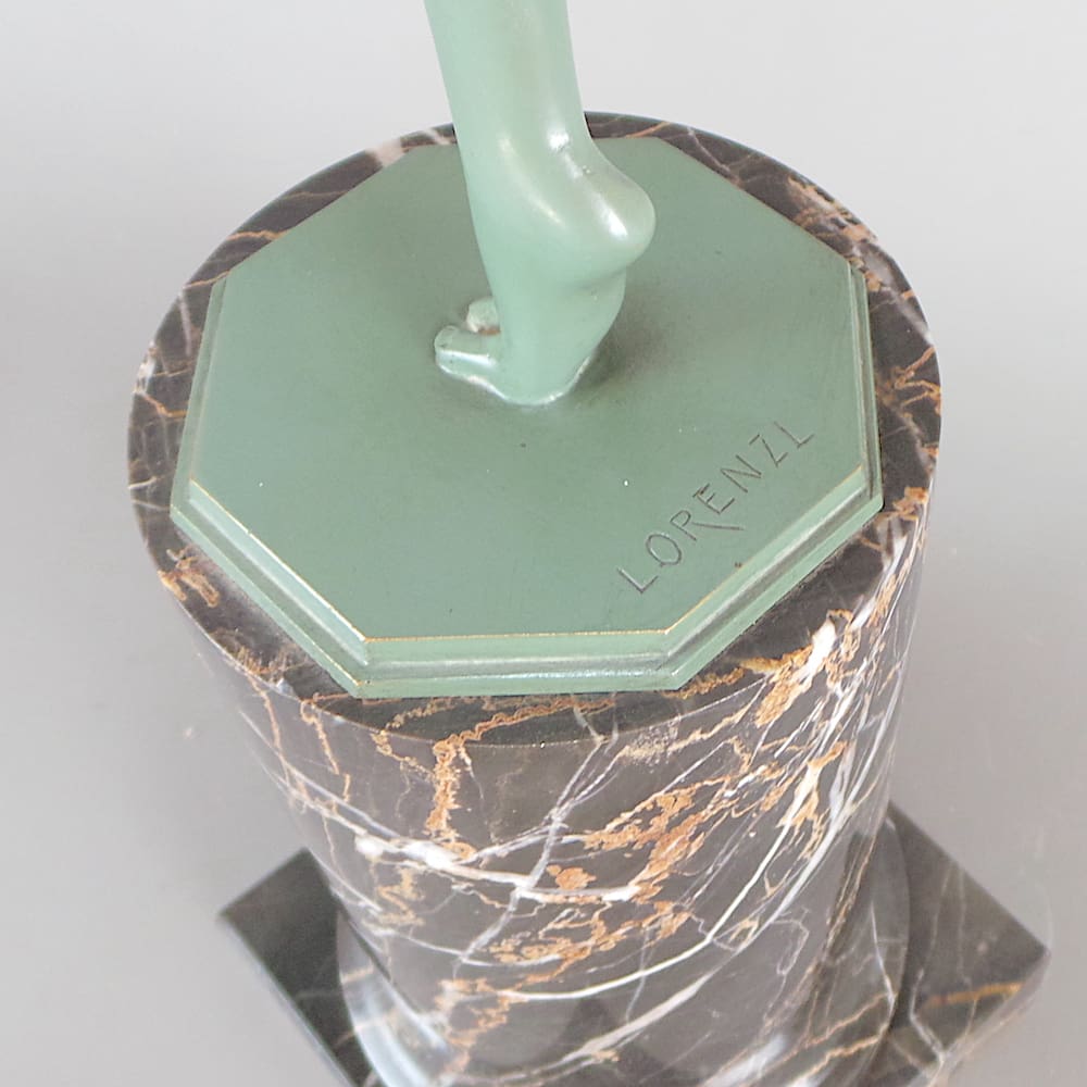 Mounted on a tall Portorro Mable base and signed Lorenzl to the bronze socle.