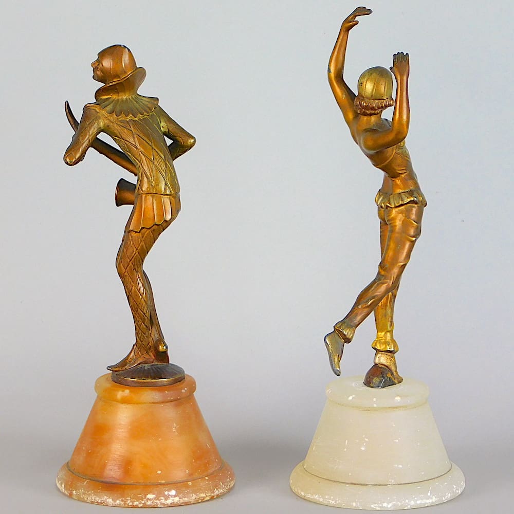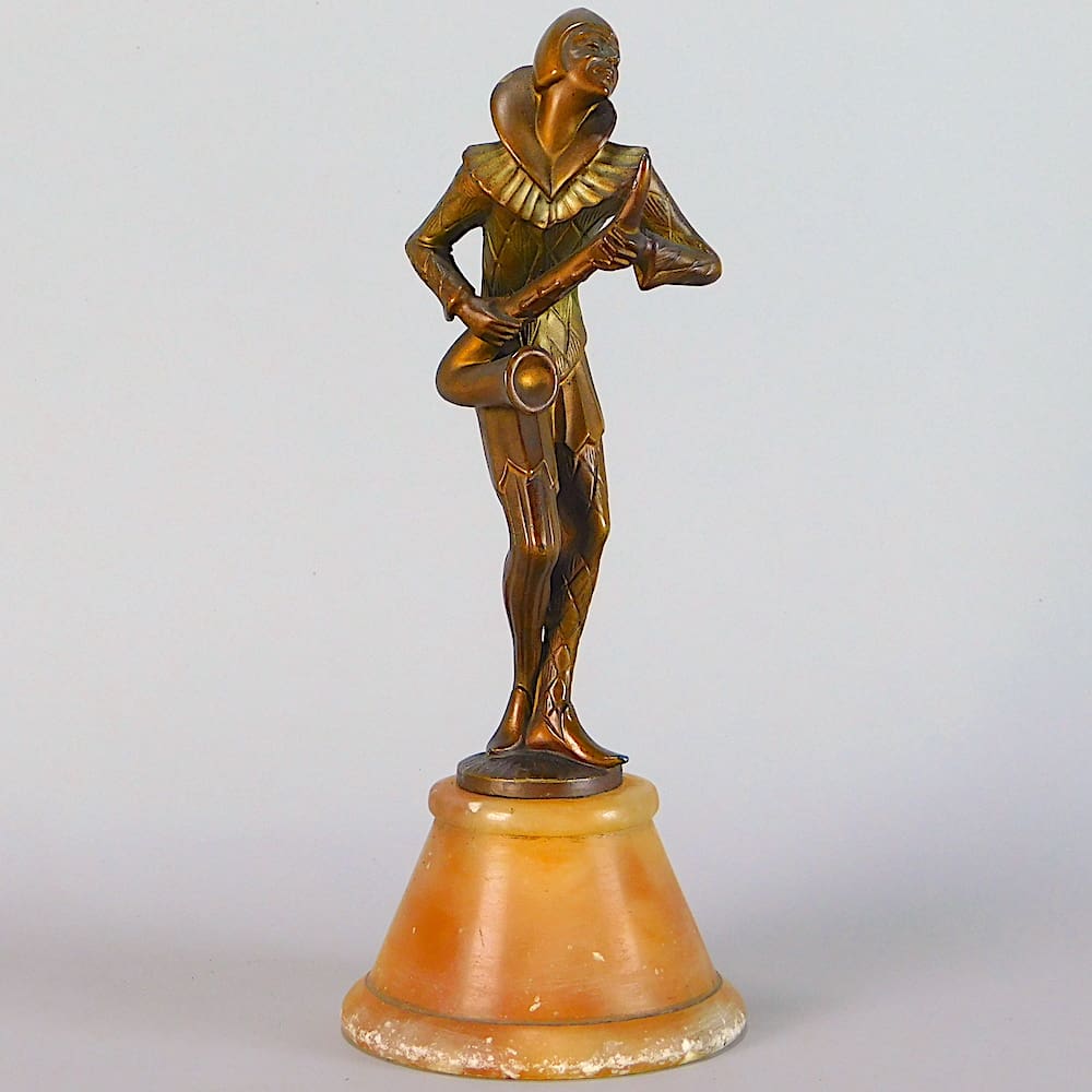 The male is playing a saxophone and wears a pierotte costume, and he measures 8.5 inches (22cm) high.