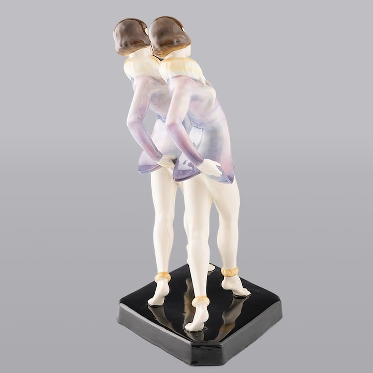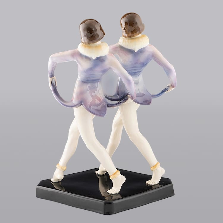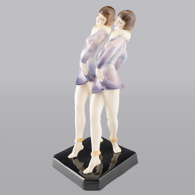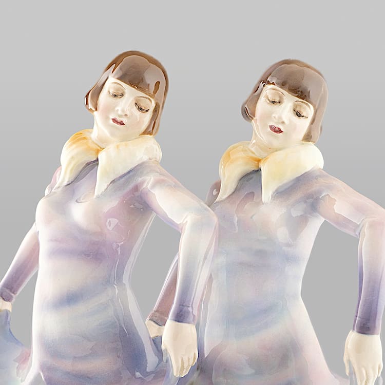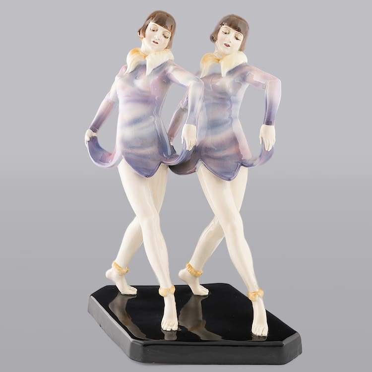 Austrian art deco ceramic statue of dancing barefoot Dolly Sisters by Dakon for Goldscheider.
