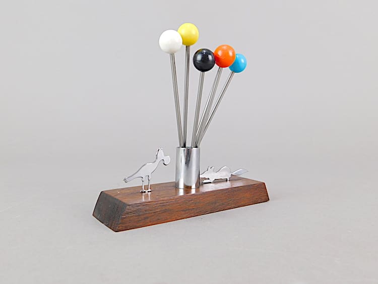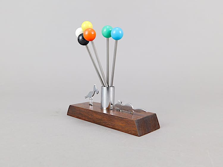 Unsigned Sudre cocktail sticks set, the fox and bird with cheese (aesops fables). Mounted on a Macassar base. There are 6 phenolic handled cocktail sticks with it.