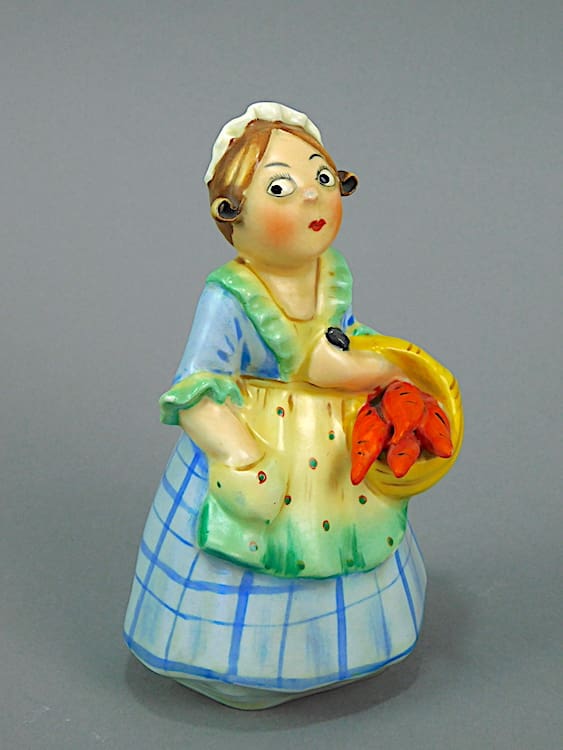 Good condition with a small mark on her nose and possibly a little touching in the ends of the carrots leaves.