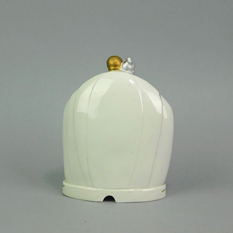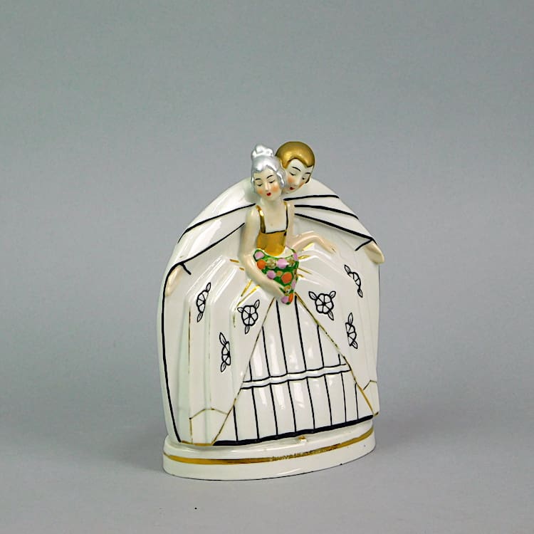 The lady holds a dish of flowers which is where you would put the perfume.