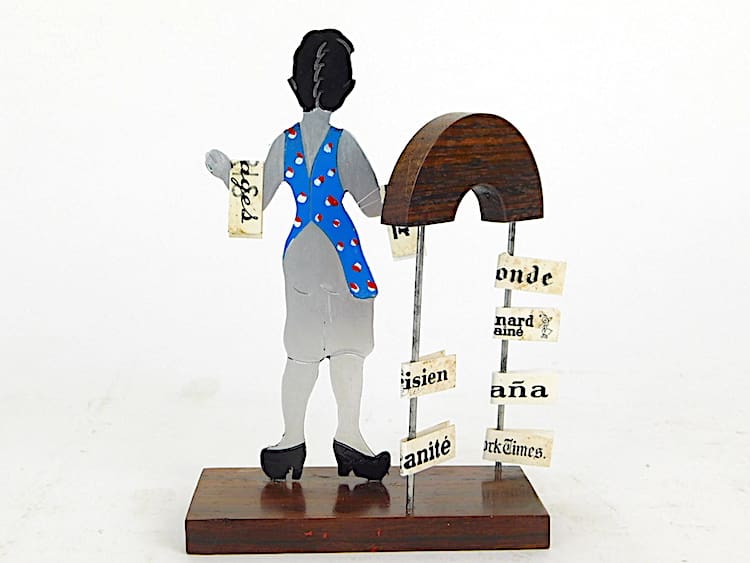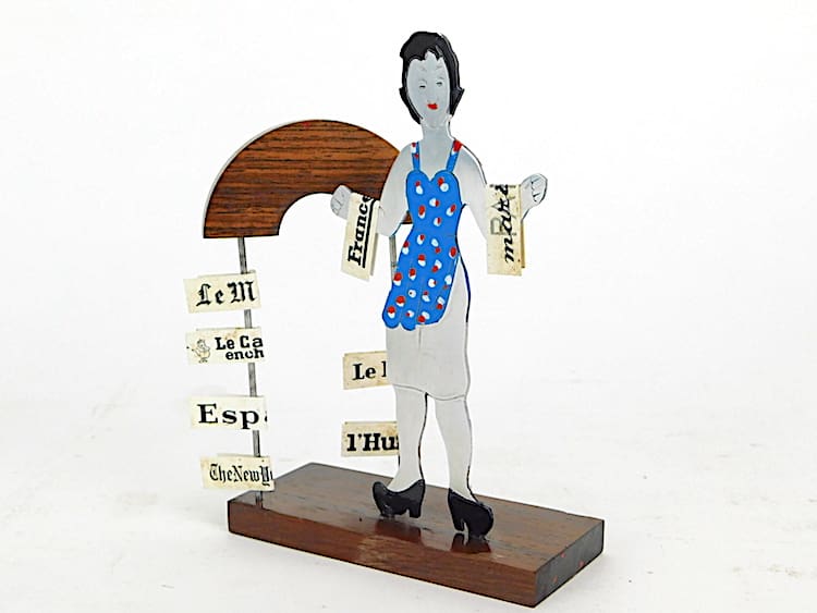 French Art Deco cocktail glass marker set modelled as a woman selling newspapers from around the world.. Made by Sudre and signed to her back foot. Mounted on a rosewood base. There are 8 phenolic newspaper glass markers with the set.