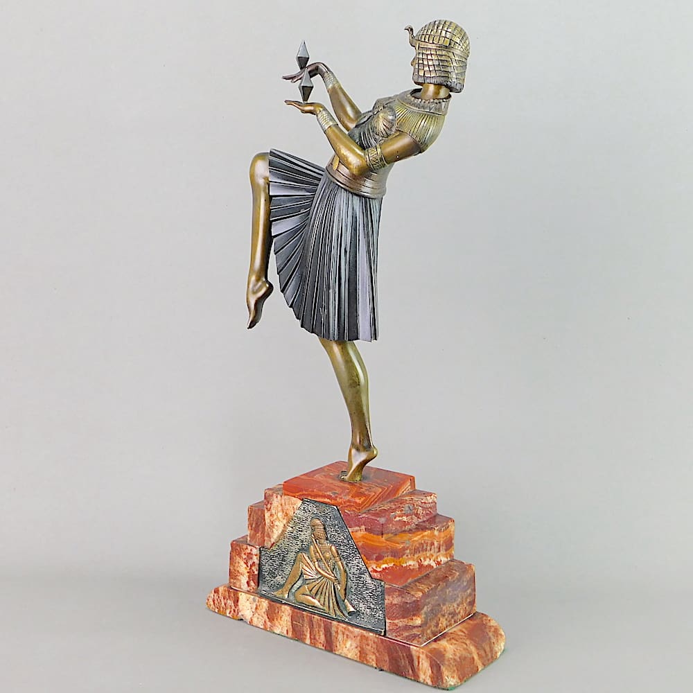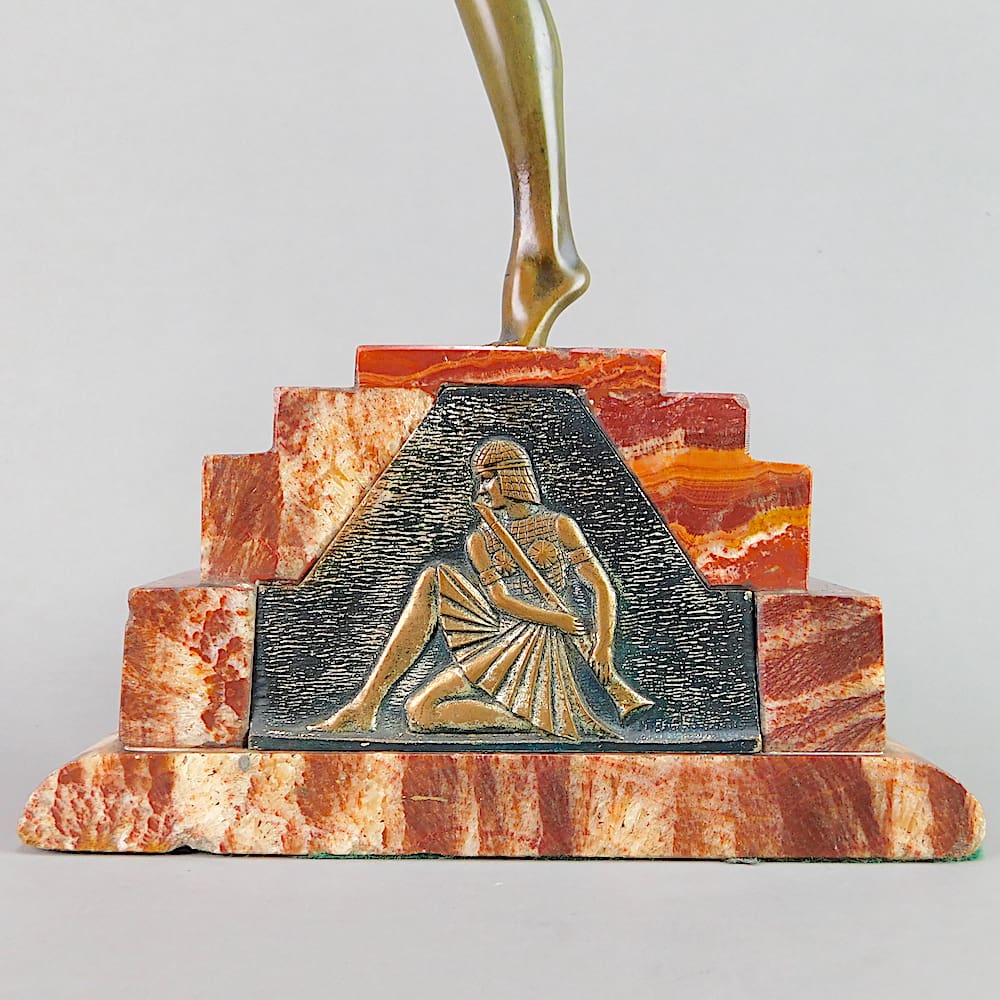 Mounted on a stepped rosso marble base with an indistinctly signed bronze plaque to the front and also signed D H Chiparus to the top of the marble base.
