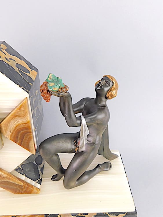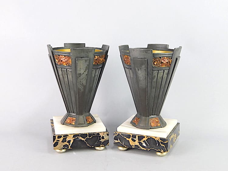 French art deco spelter three piece clock set with urn side pieces.