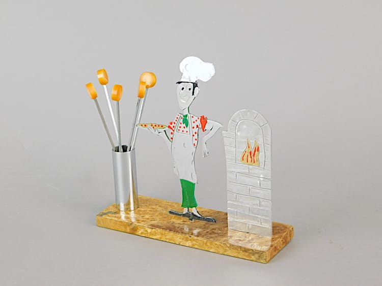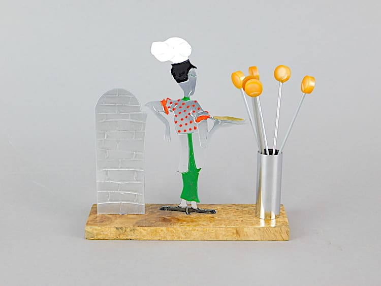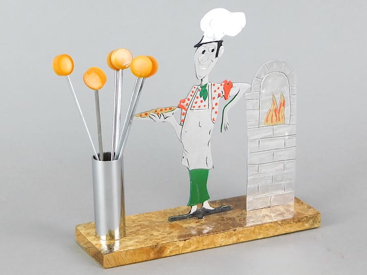 Unsigned Sudre cocktail sticks set, larger than average. Mounted on an amboyne wooden base. There are 6 phenolic handled cocktail sticks with it.