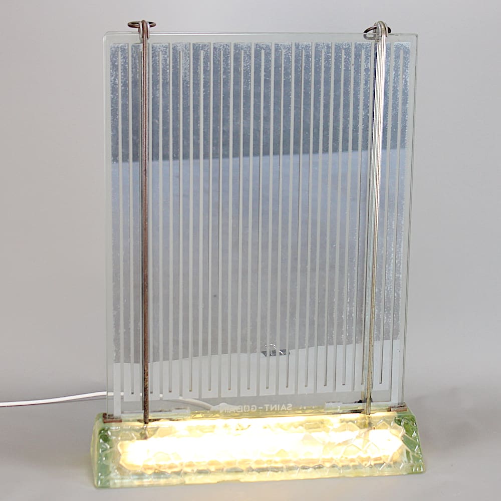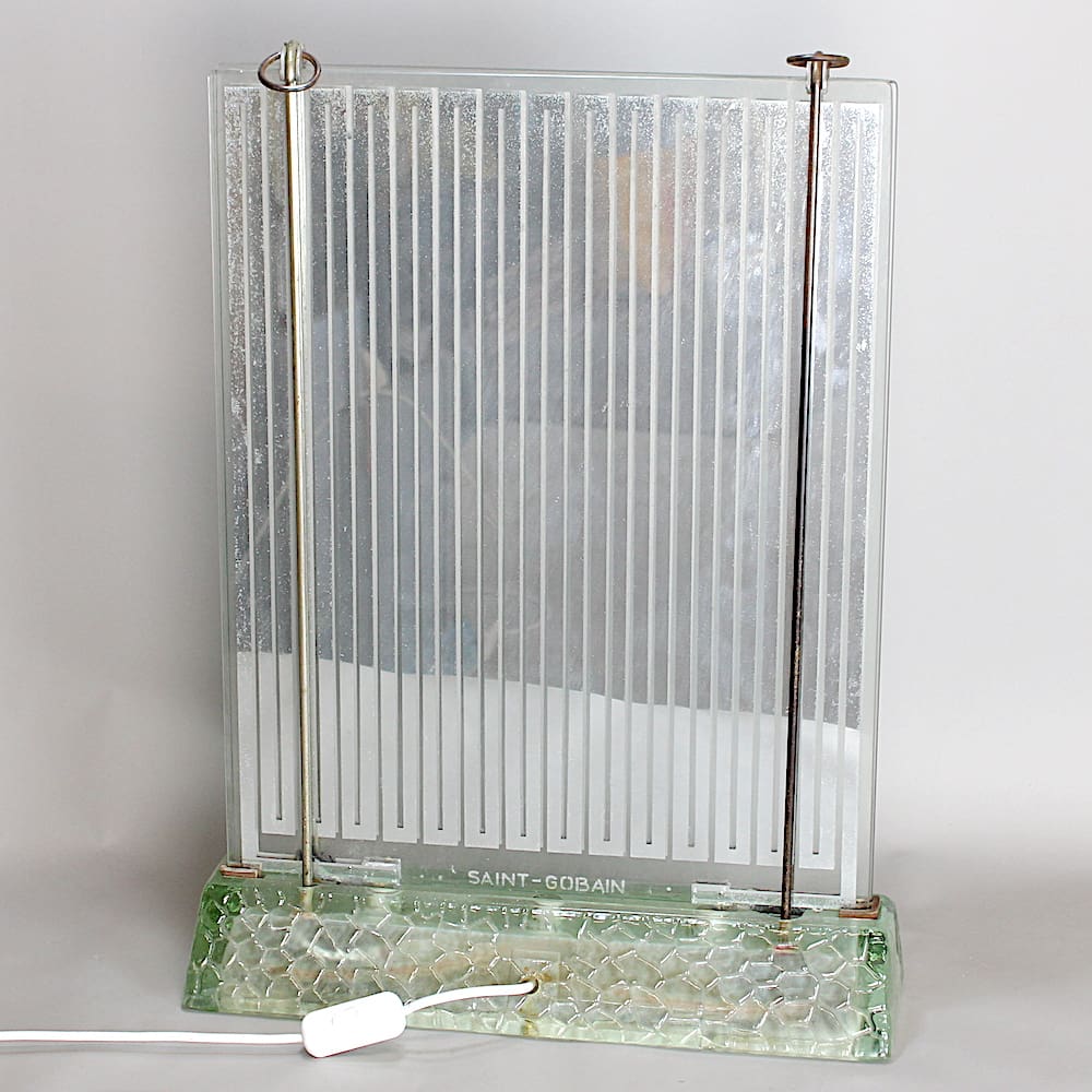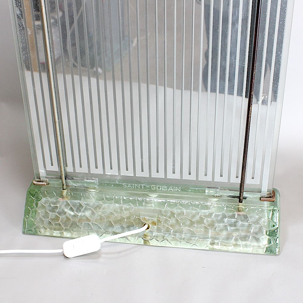 Saint Gobain etched to the base. This lamp was both a heater and a lamp with a tubular lamp in the base and electrical elements in the uprights designed to give light and heat.