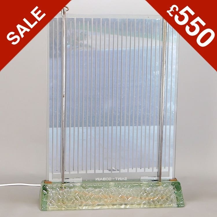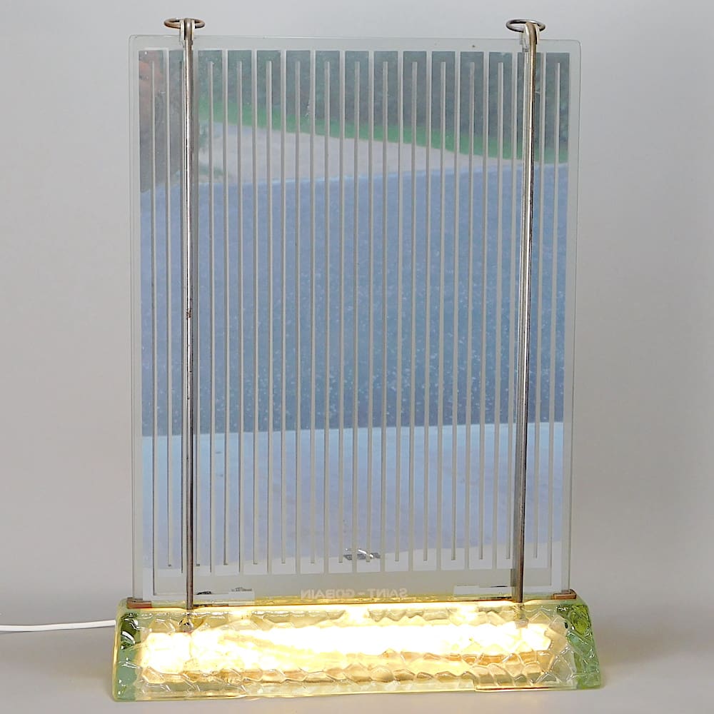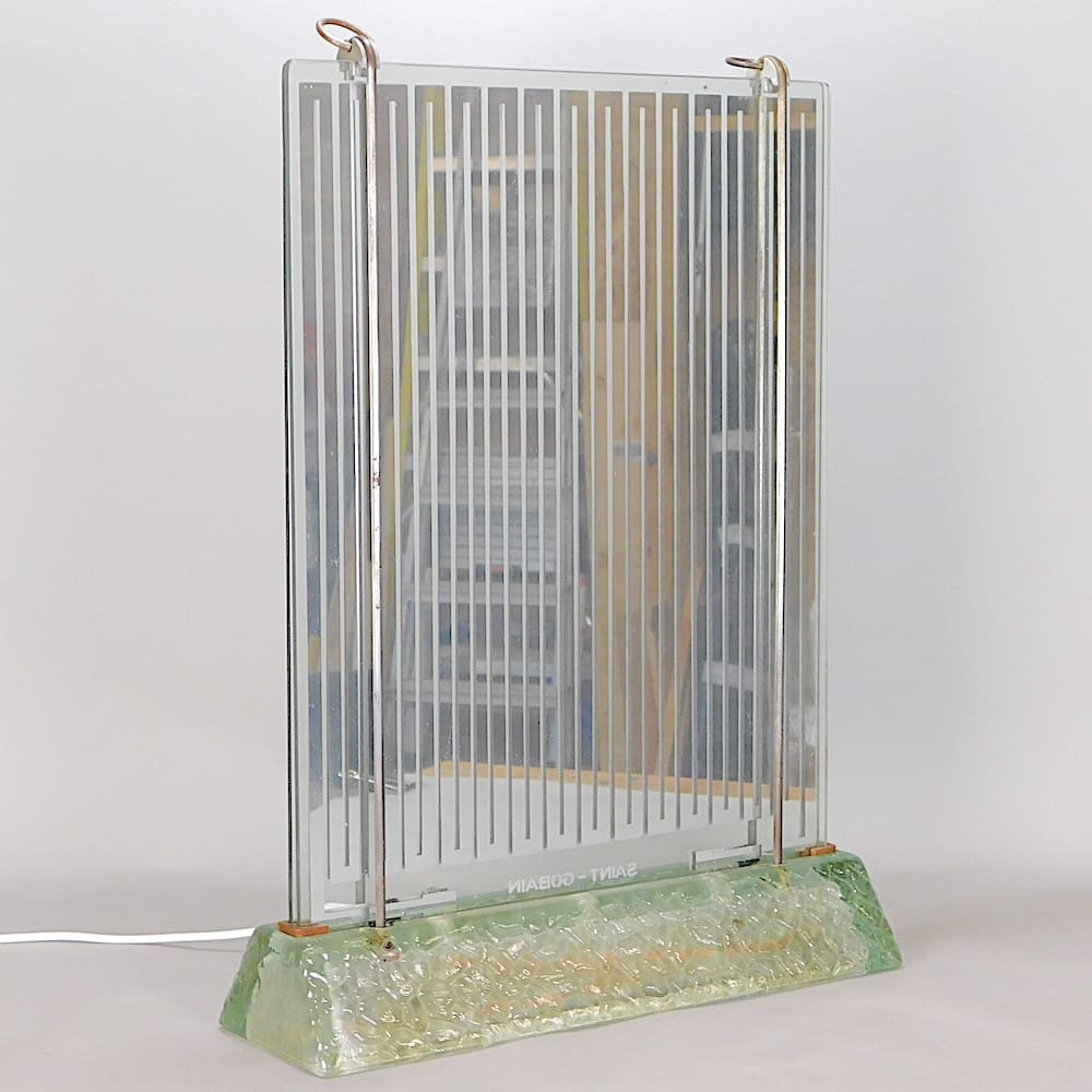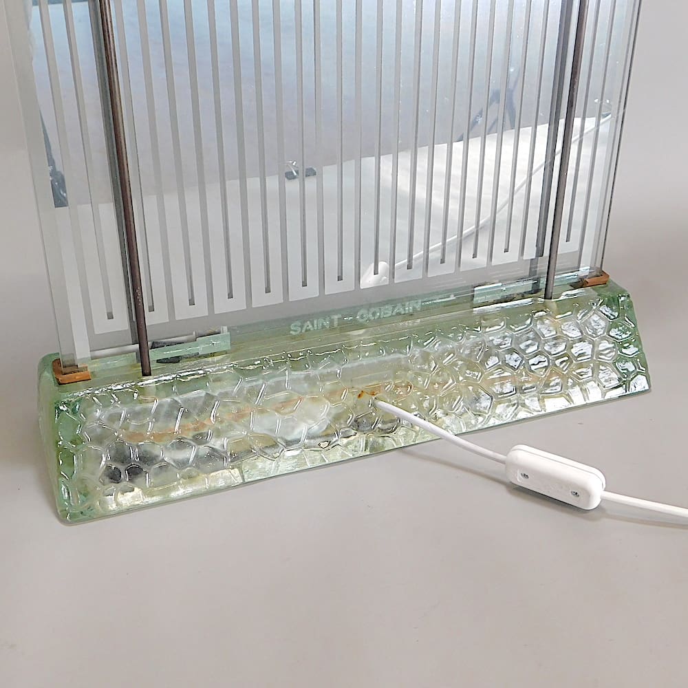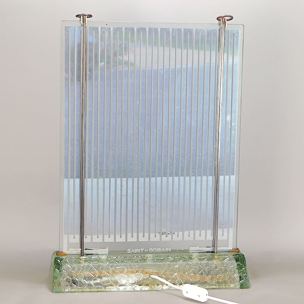 Saint Gobain etched to the base. This lamp was both a heater and a lamp with a tubular lamp in the base and electrical elements in the uprights designed to give light and heat.