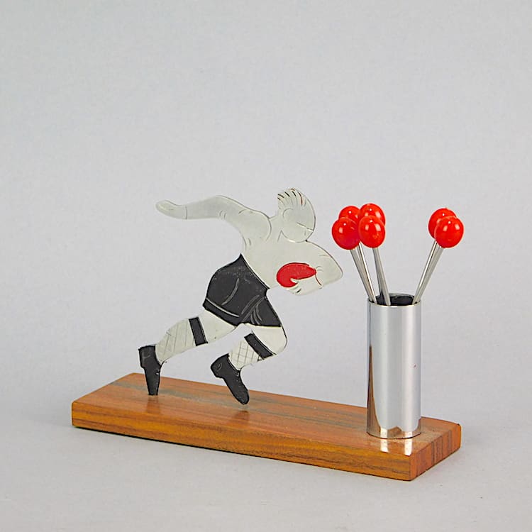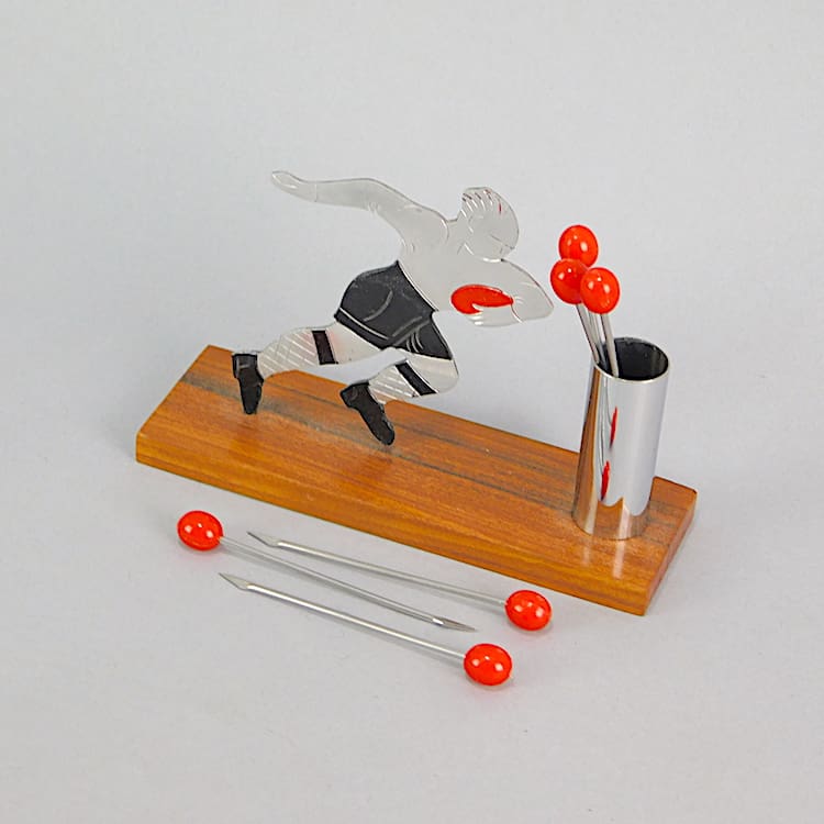 A French wooden base cocktail sticks set. Unsigned but undoubtedly by Sudre with a 2 dimensional bartender. The cocktail sticks are the items on the bar.