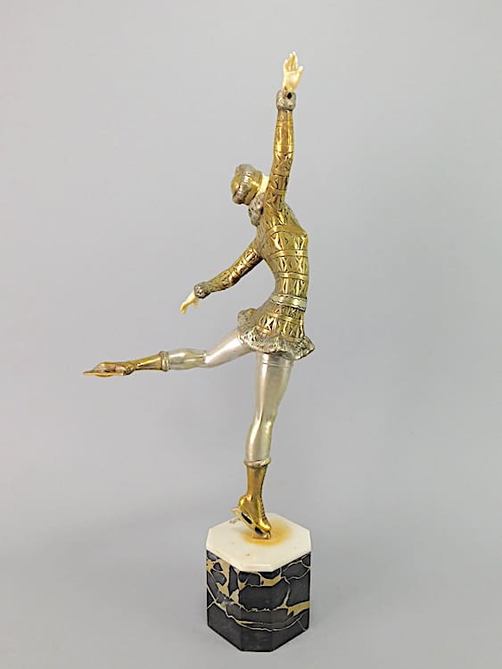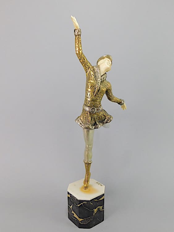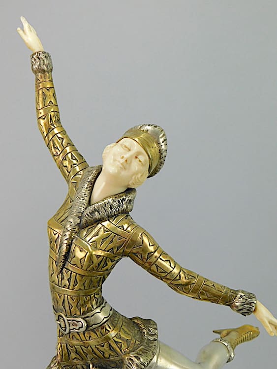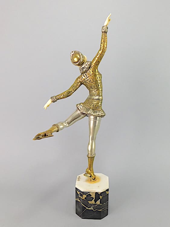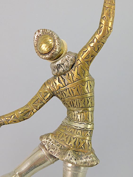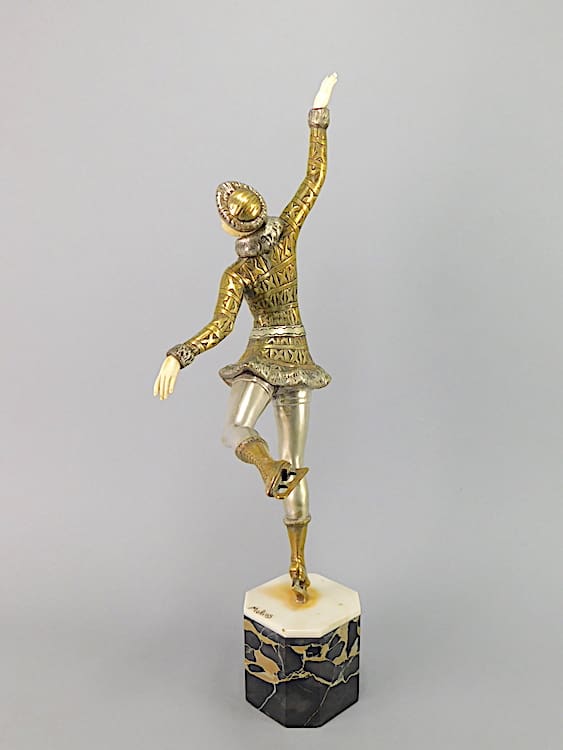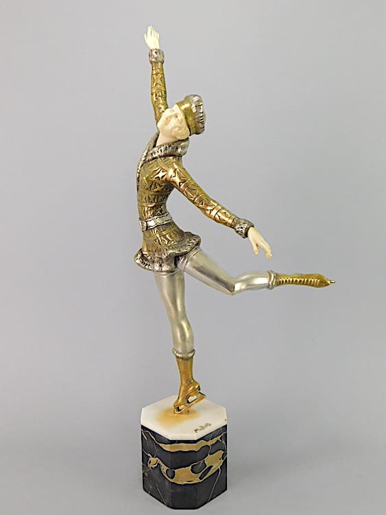Large French chryselaphantine art deco ice skater, wearing fur trimmed Russian hat, jacket and boots, by Enrique Molins Balleste.