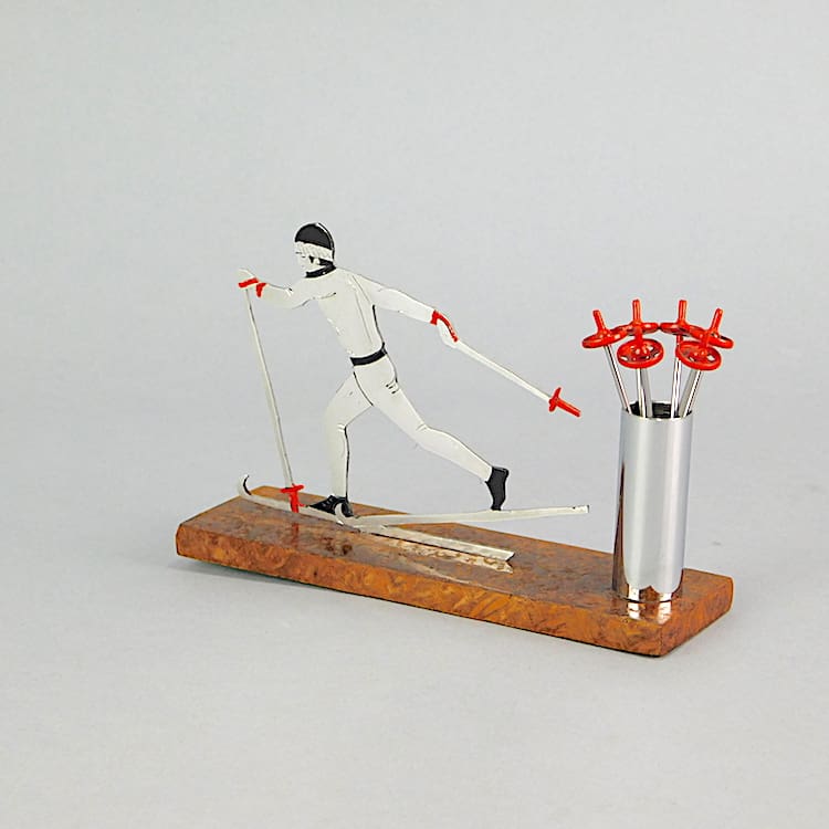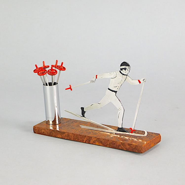 Another French cocktail sticks sets by Sudre (but unsigned). This one has a skier on an amboyne wooden base. The chrome cup to the side holds the metal cocktail sticks.