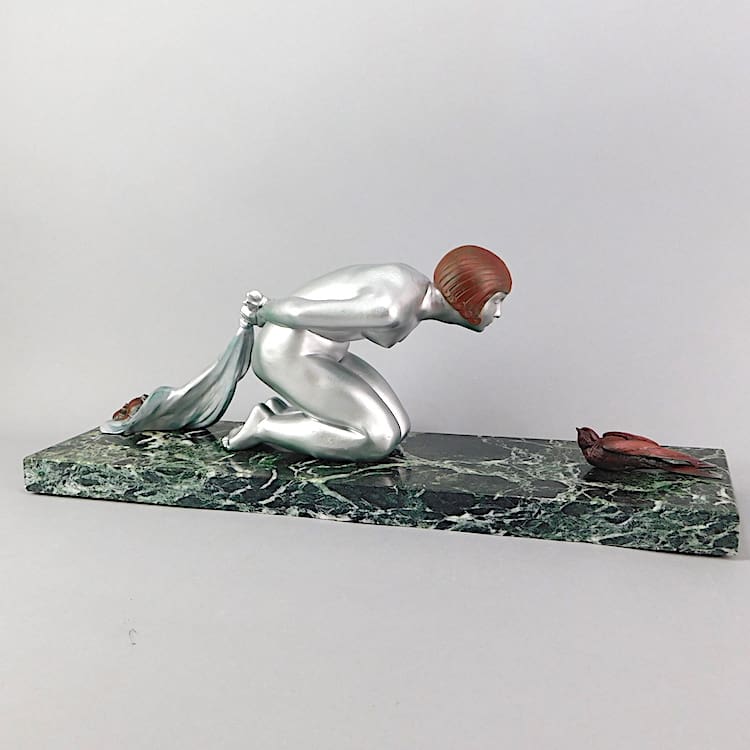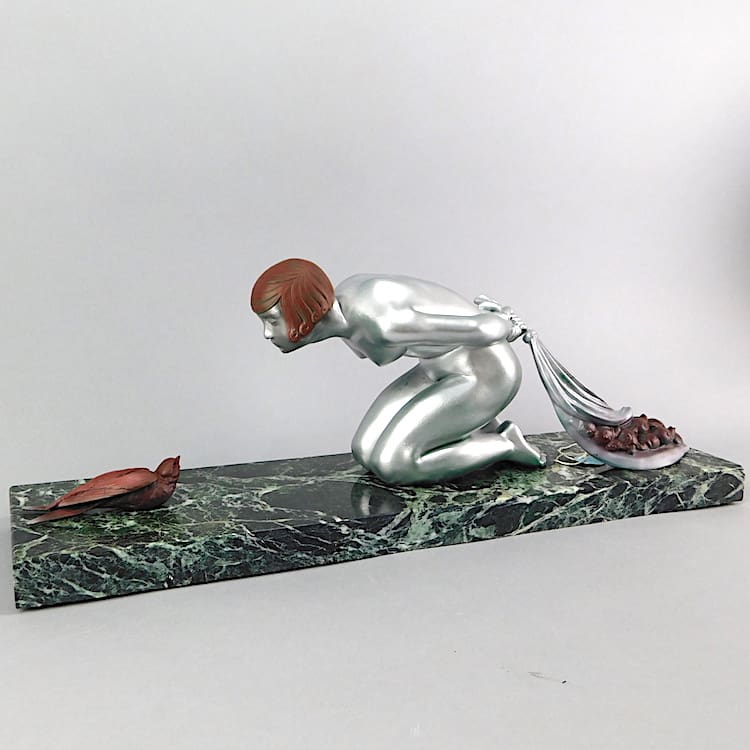 Large French art deco spelter figural group of a lady with a sack full of snails hiding them from a bird.
