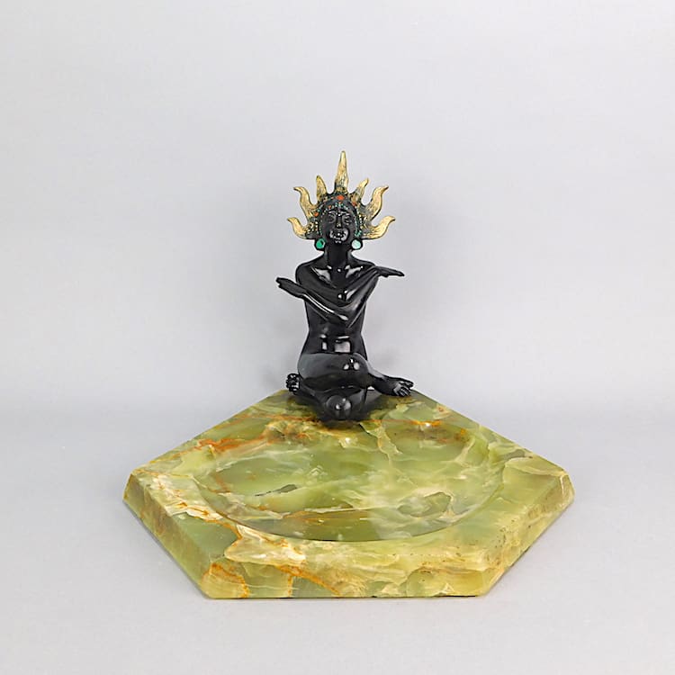 Rare bronze art deco seated sun goddess statue an unsigned Lorenzl. Sitting on a Brazilian onyx large vide poche base. She has accents of red and green colouring to her head dress.
