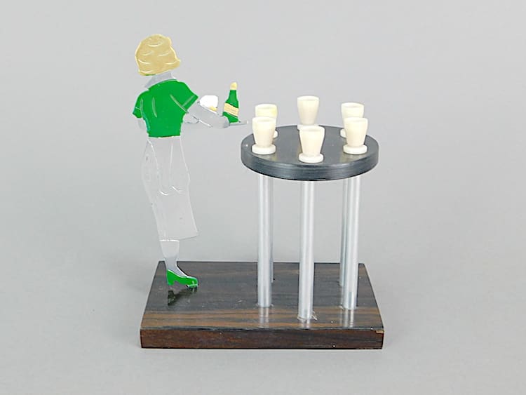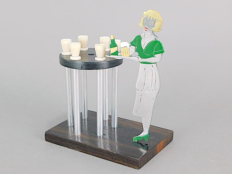 French art deco cocktail sticks set – an unsigned Sudre, made by Cado. A rare one that I have never seen before. A waitress serving drinks and the beer mugs are the cocktail sticks. Mounted on a rosewood base.