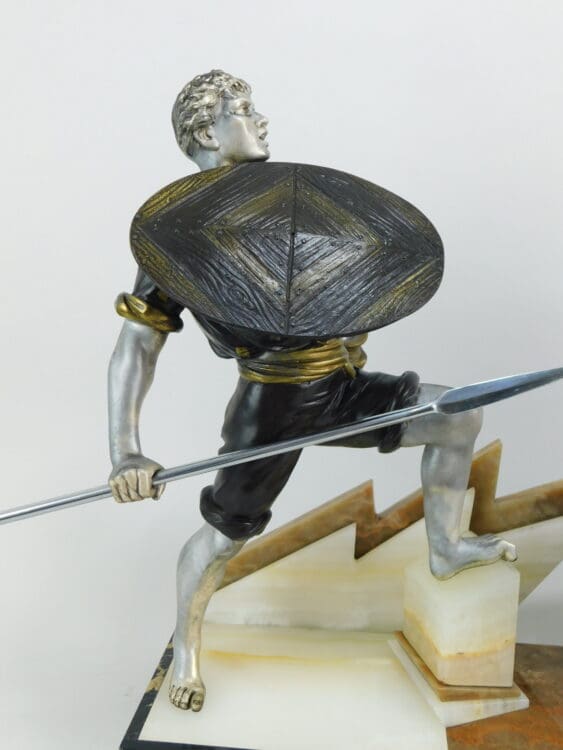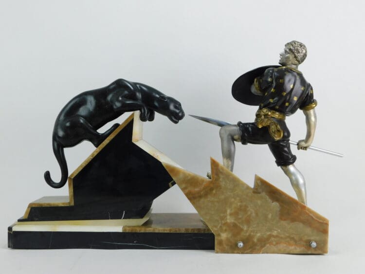 Huge French spelter male warrior and leopard group with wonderful zig zag and layered portorro marble and onyx base. An unsigned piece possibly by Oulene.