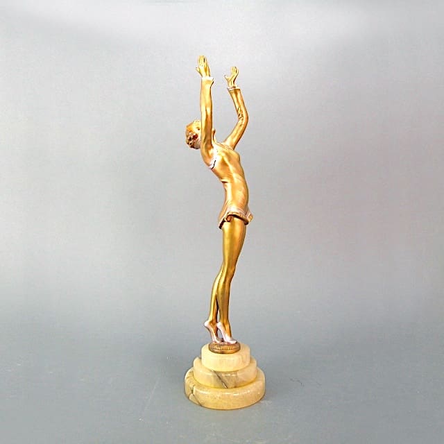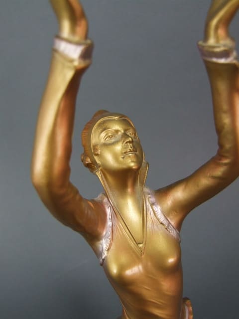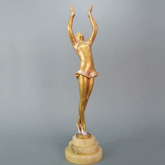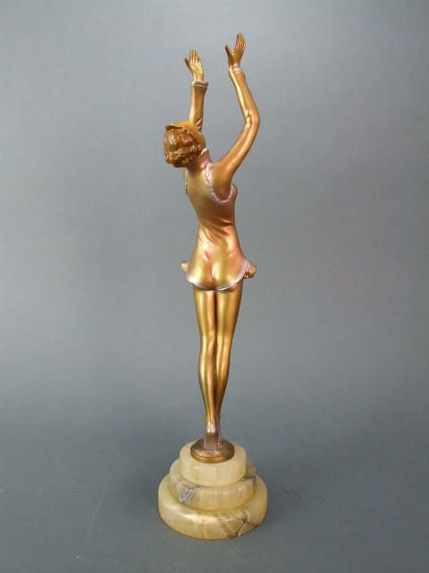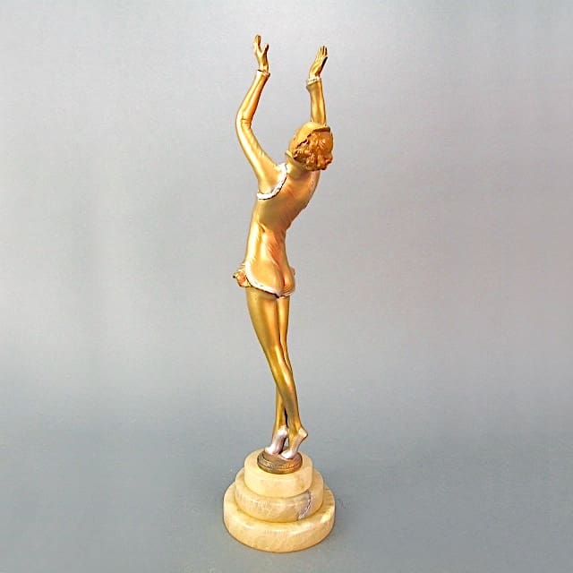 Austrian gilt spelter theatrical dancer, an unsigned Lorenzl raised on an alabaster base. I also have another similar dancer to this one and the two make a nice pair – (F1836).