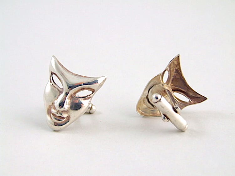 French art deco silver theatrical mask cufflinks. Silver plated metal with black enamel eye detail.