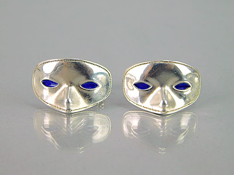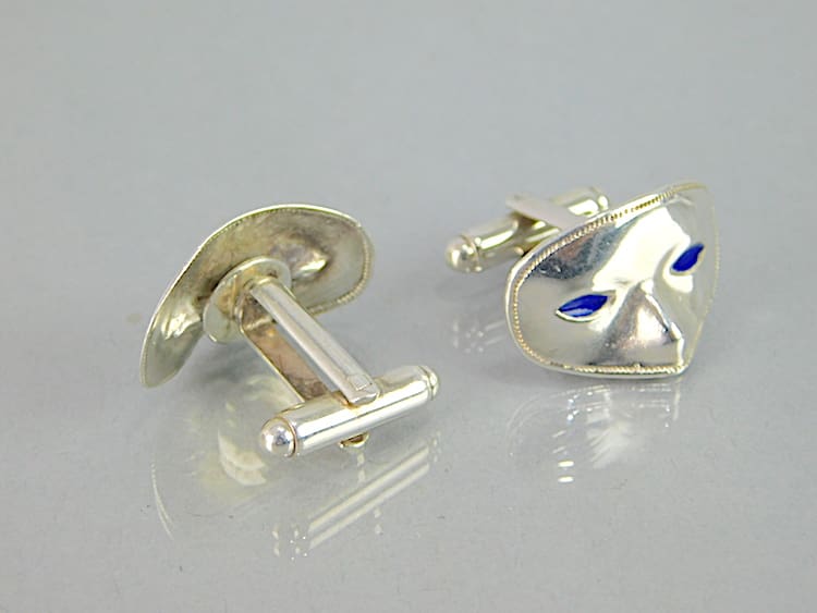 French art deco silver theatrical mask cufflinks. Silver plated metal with blue enamel eye detail.