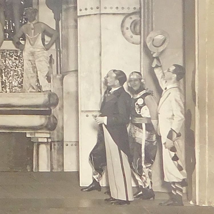 Original Art Deco Folies Bergere photograph of a theatrical performance during the 1930s. This is an official original photo by Walery and it is certified with a stamp to the back – Photographie Walery. This photograph is of a performance showing machines with cogs and gears and people dressed as art deco robots. The scenery is very similar to scenes in the Great Dictator by Charlie Chaplin.