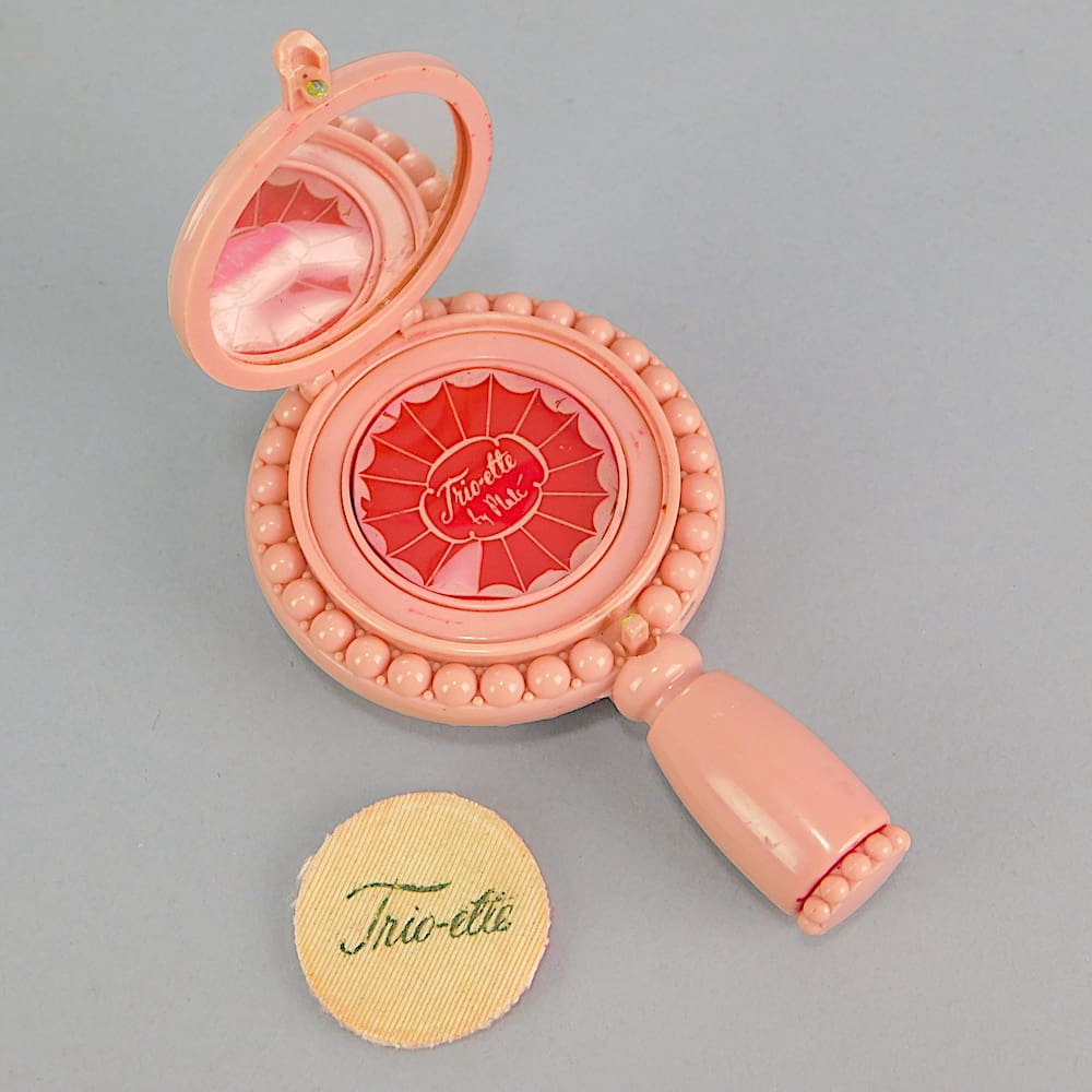Rare American boxed phenolic Trio-ette compact by Plate made in 1945. Same compact can be seen in the Millers compact book on page 31, this one is in its original box. It has 3 sections, one for rouge (new and unused) one fort powder and in the handle is the lipstick. The pattern to the lid is a rose and to he back is a mirror in good condition.