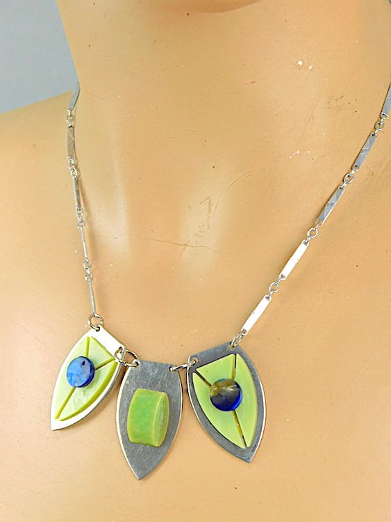 1930’s green galalith and chrome shield necklace with intricate chain patterning.