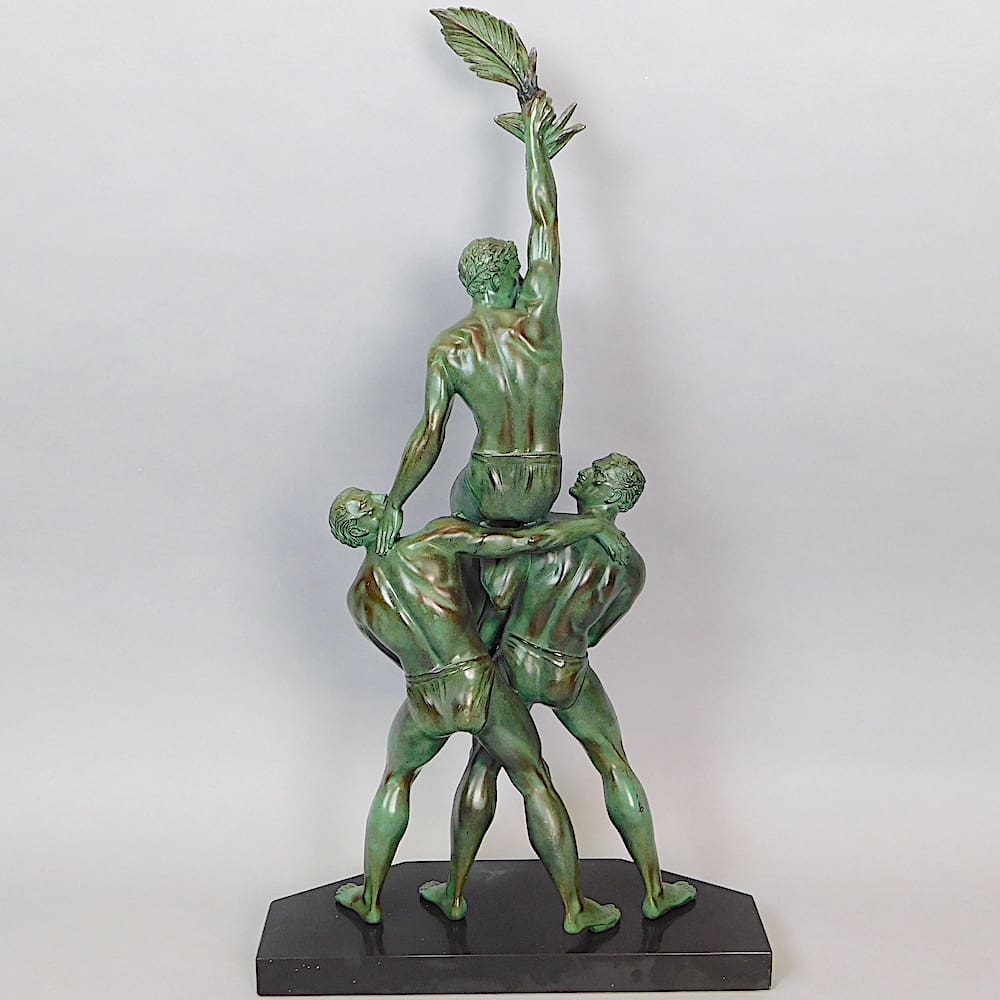 This three male athlete group was made in the mid 1920’s. This group apparently representing Peace and Victory. Signed in the marble base, Le Faguays.