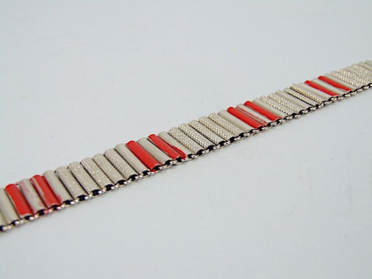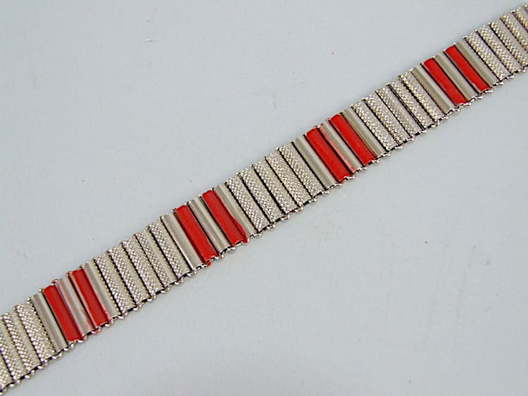 Chromed metal with red enamel bracelet. Made by Bengel in the early 1930’s.