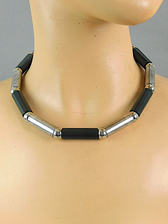 Modernist chrome and dark green galalith tubes necklace made by Bengel in the early 1930’s and fitted with a screw clasp.