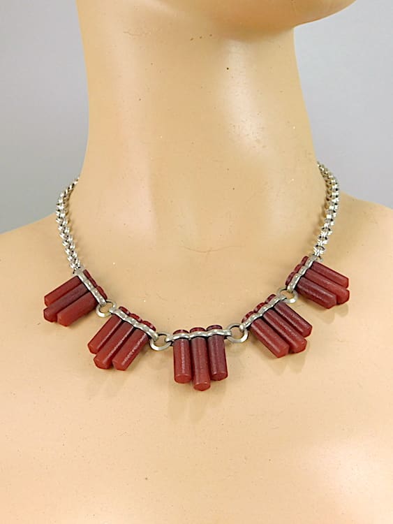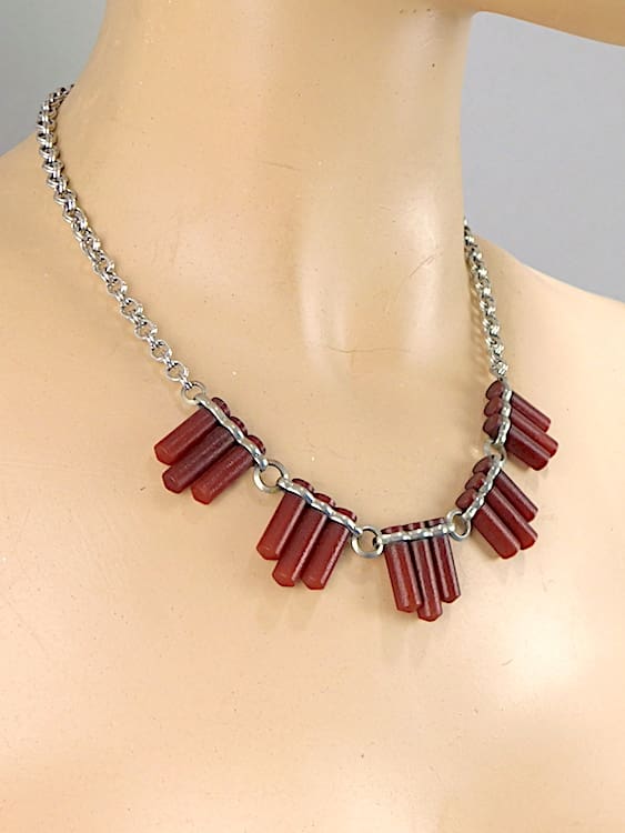 Early 1930’s necklace with tubes of red galalith strung on a chrome links chain.
