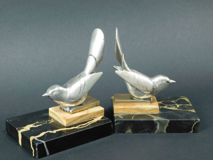 French art deco silvered bronze bird bookends signed A. Tulre. Each bird mounted on portorro marble bases.