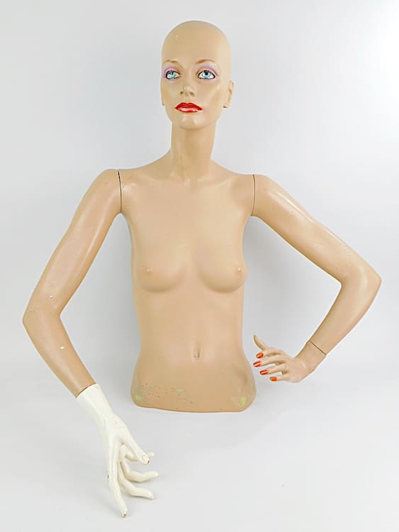 1960’s fibreglass half torso Twiggy/Quant style mannequin. Clothing, jewellery and wig not sold with the mannequin.