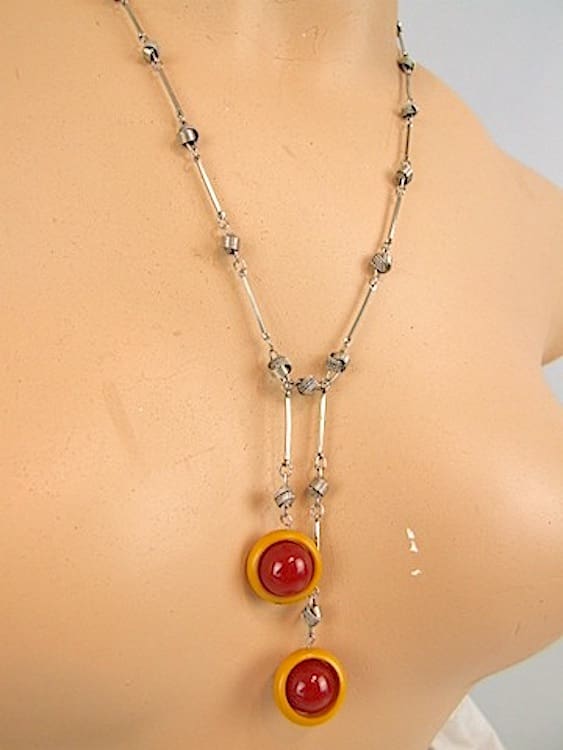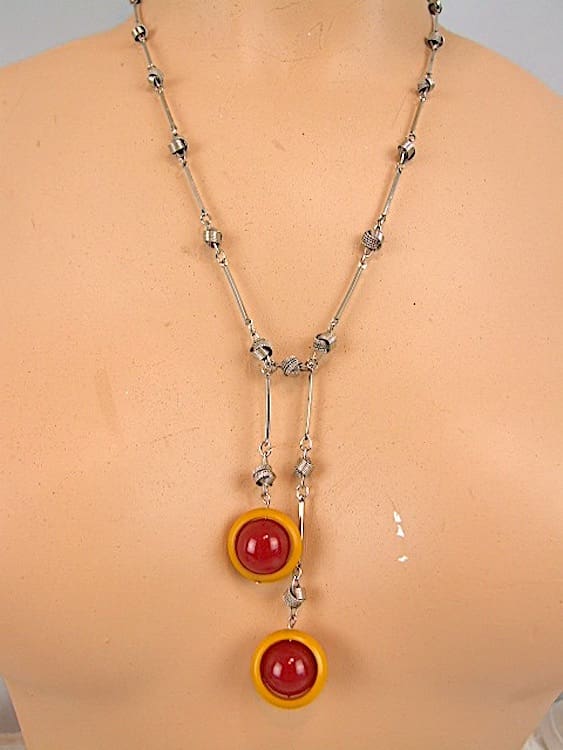 Made in the early 1930’s with twisted chain detail and central red and orange galalith ball detail.