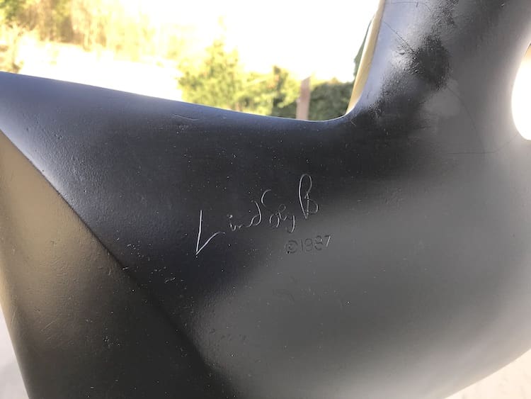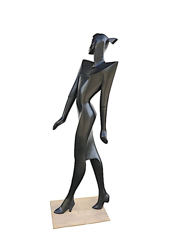 This fibre glass statue was made by Lindsey B in 1987, she is a unique piece and her title was Tex. She has a satin black body with red lips and stands on a metal sheet base. When Lindsey B was making her the mould broke so only one was actually produced and this is her. Earlier Tex statues were produced but this was to be the new modified Tex but it was never put into production. She was sold to the Debenhams store in London. Signed on her left hand back shoulder Lindsey B 1987.