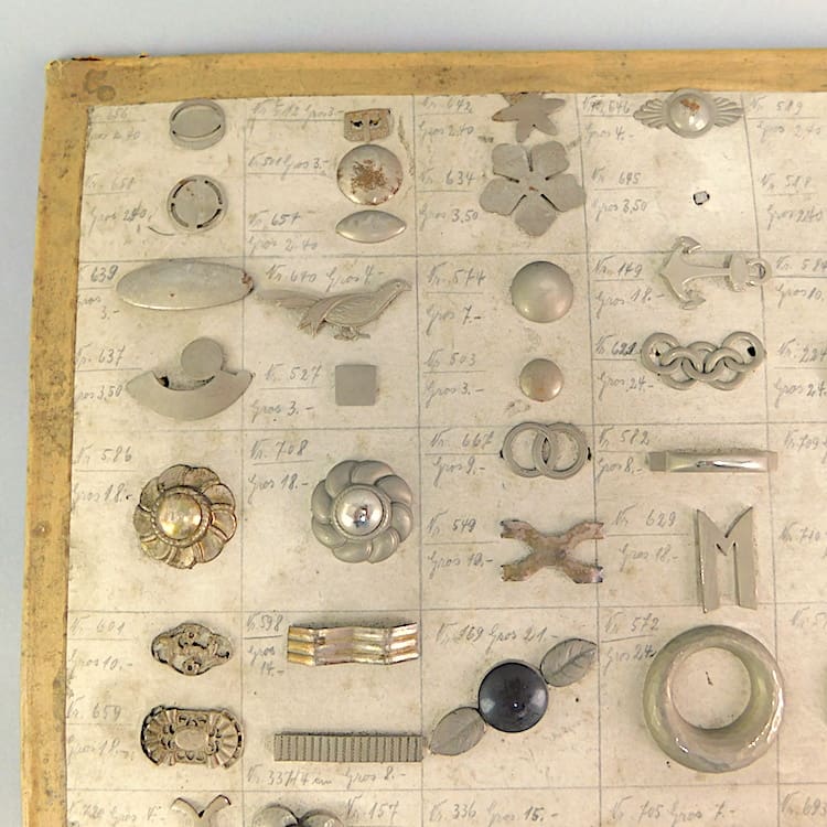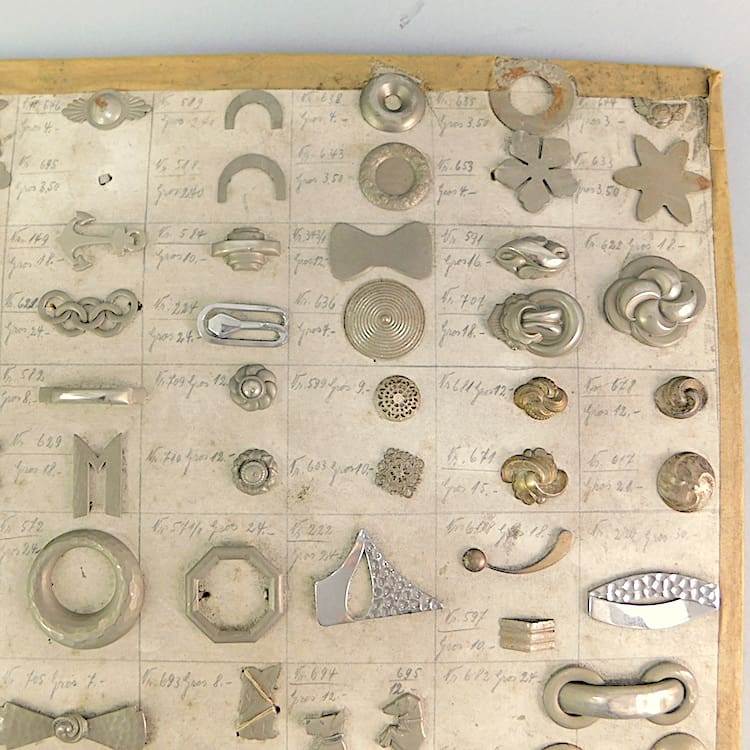 This is a piece of history, it is an original 1920/30s findings card displaying parts for the making of Jakob Bengel jewellery items like brooches. This card has come from the Bengel workshop it shows the findings and written in pencil are the original stock numbers for each piece. With metal scrolls, swirls, dogs and flowers and various shapes. It is complete except for one part.