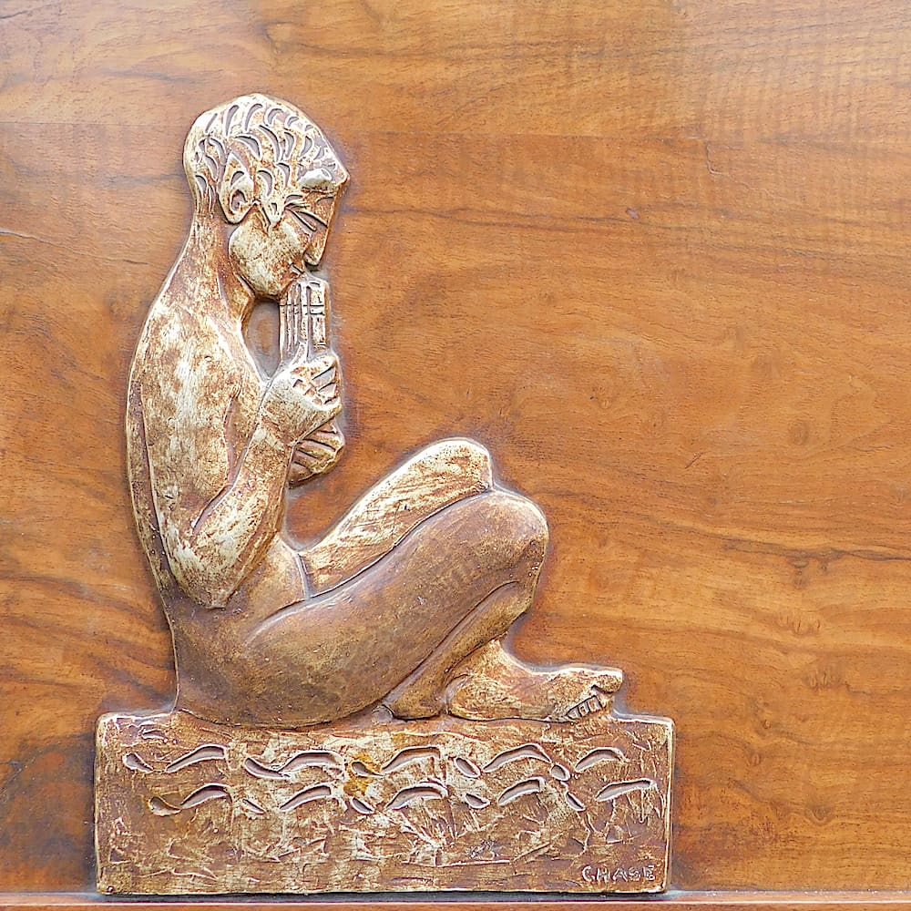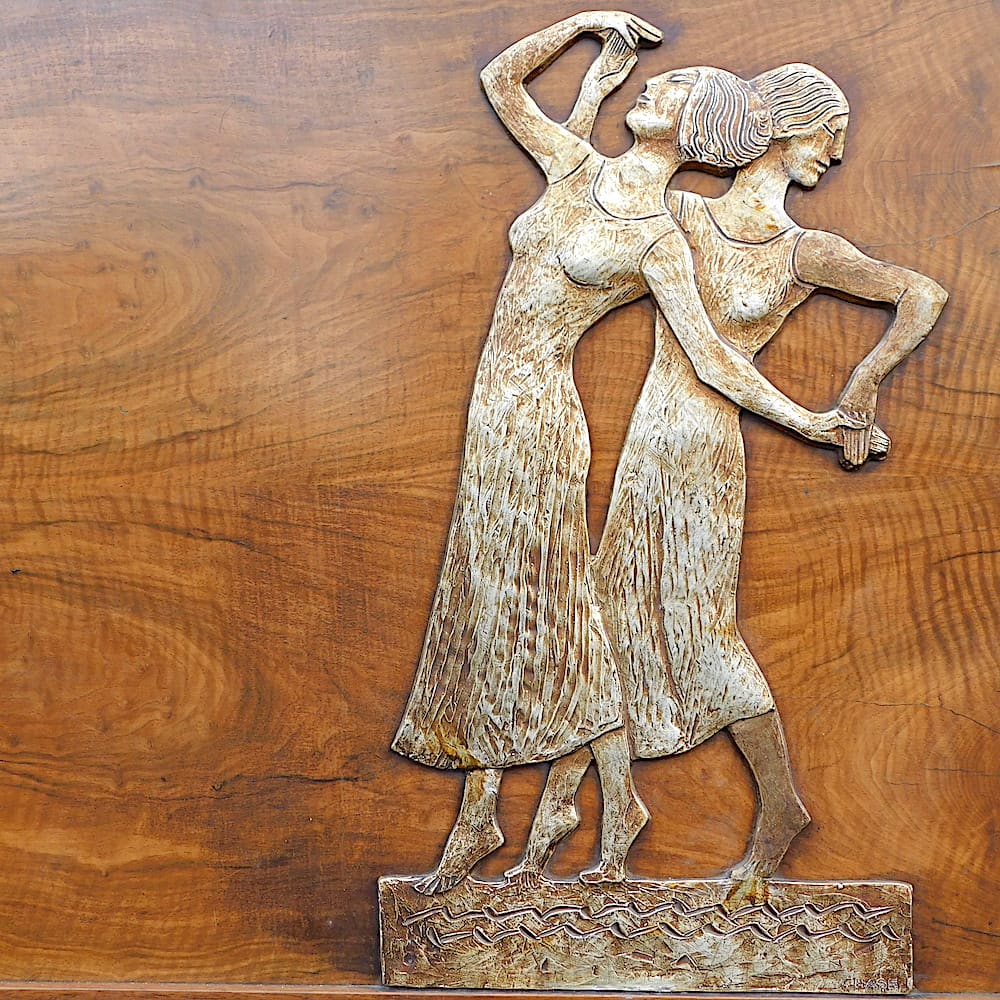 It depicts two dancing ladies and a pan flute figure moulded on a walnut back panel.