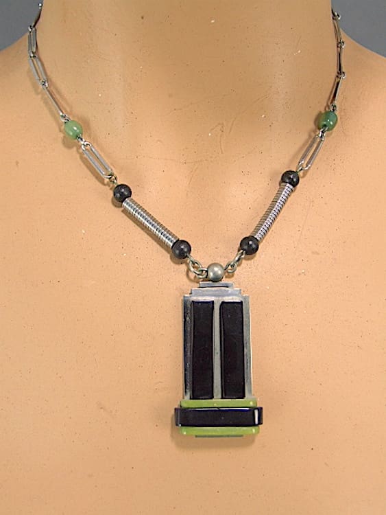 Black and green galalith pendant necklace. Made by Bengel in the early 1930s.
