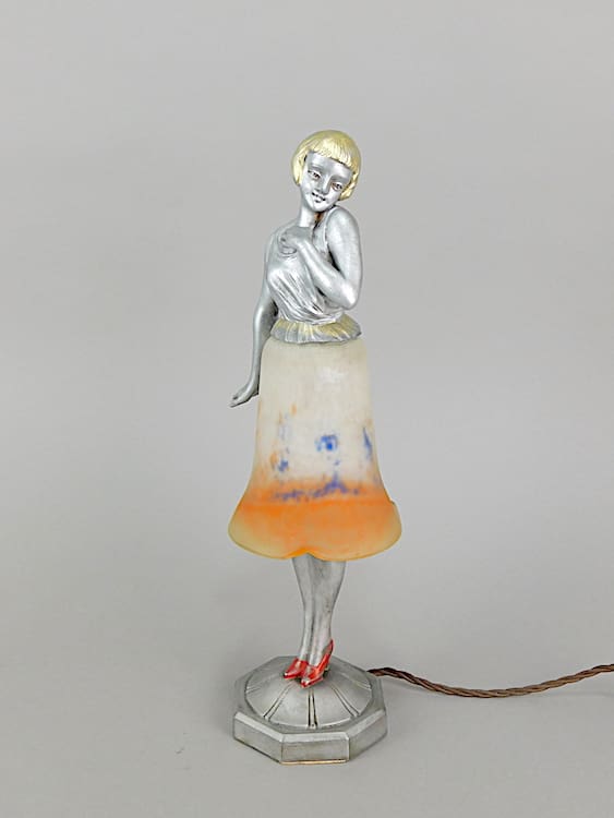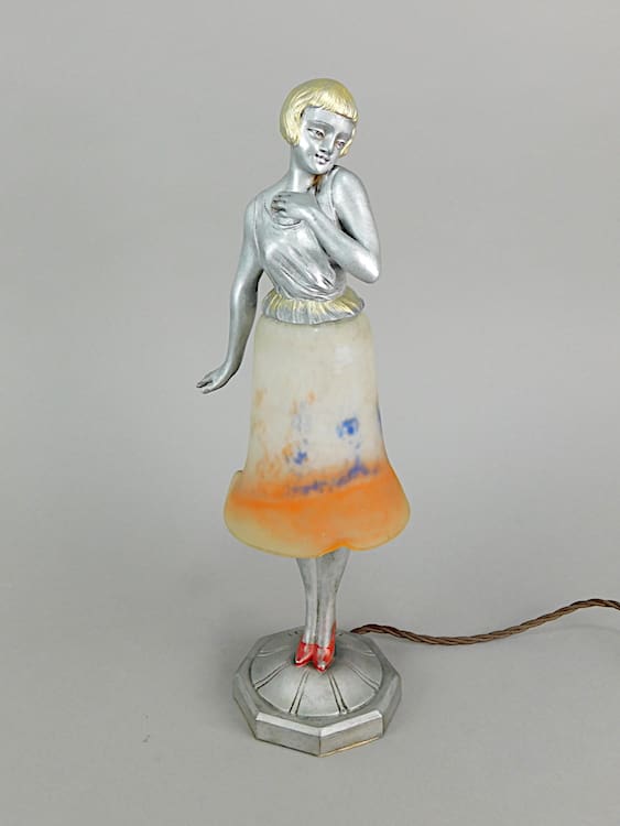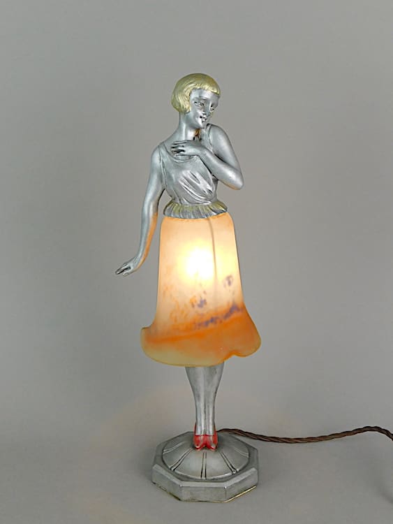A French spelter lady with a Muller Freres style glass skirt shade. The base is marked Brevette.