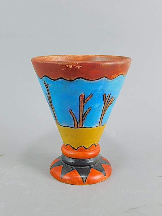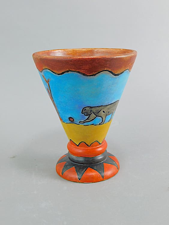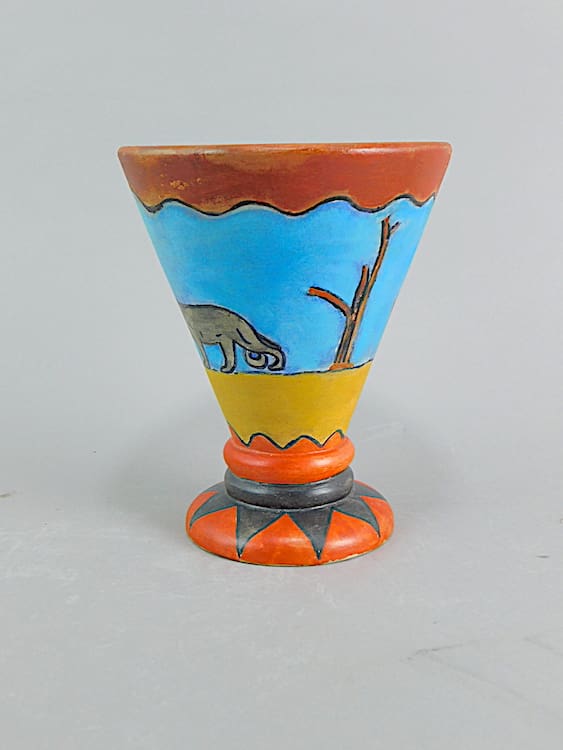 A brightly hand painted but very stylish earthenware vase made in Belgium during the 1930’s. Crudely but stylistically hand painted with an animal and geometric design. Initialed by the artist A.D.